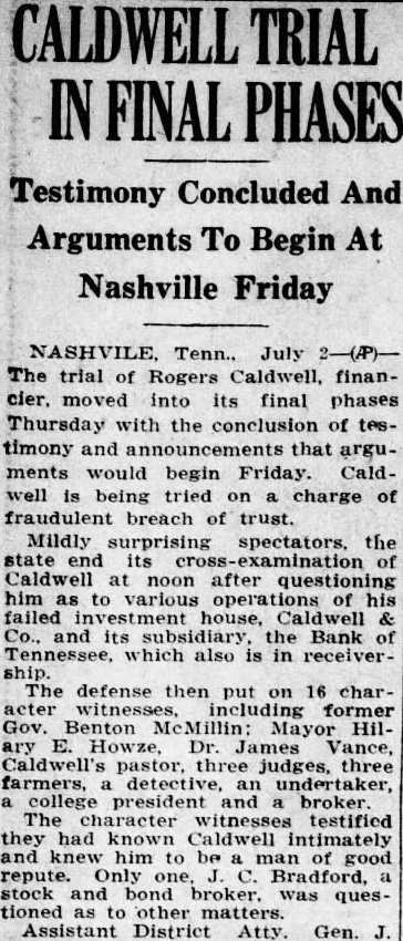 NASHVILE Tenn., July 2-(P)The trial of Rogers Caldwell, financier, moved into its final phases Thursday with the conclusion of testimony and announcements that arguments would begin Friday. Caldwell is being tried on charge of fraudulent breach of trust. Mildly surprising spectators, the state end its examination of Caldwell at noon after questioning him as to various operations of his failed investment house, Caldwell & Co., and its subsidiary, the Bank of Tennessee, which also is in receivership. The defense then put on 16 character witnesses, including former Gov. Benton McMillin: Mayor Hilary E. Howze, Dr. James Vance, Caldwell's pastor, three judges, three farmers, detective, an undertaker, a college president and broker. The character witnesses testified they had known Caldwell intimately and knew him to be a man of good repute. Only one. C. Bradford, a stock and bond broker. was questioned as to other matters. Assistant District Atty. Gen. J.
