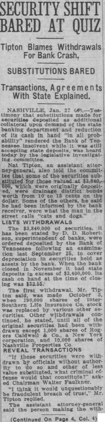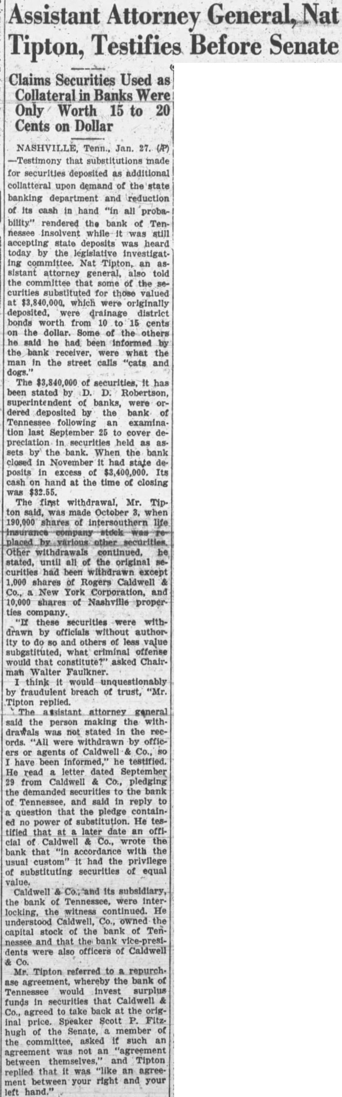 Tenn., Jan. (AP) -Testimony substitutions made for securities deposited as additional collatteral upon demand of the state banking and reduction its cash hand all probability" rendered the bank of Teninsolvent while still accepting state deposits was heard today the legislative investigatcommittee. Nat Tipton, an sistant attorney general, told committee some of the for those valued which were originally deposited, district bonds worth from 10 15 cents the dollar. of the he had been bank what the in the street calls "cats and securities, has stated banks, were deposited the bank following examinalast cover preciation held by bank. When the bank closed November had state excess hand at the time of closing The first Mr. October shares intersouthern Other withdrawals continued, stated, until all the original curities had been withdrawn except shares Rogers Caldwell New York Corporation, and shares Nashville properties company. these securities were withdrawn by officials authorand others of value subgstituted, what criminal offense that asked ChairWalter Faulkner. think would fraudulent breach of trust, Tipton replied. assistant attorney general the person making not stated the ords. agents Caldwell been testified. He letter dated September from Caldwell Co., pledging the Tennessee, and said reply question pledge He tified later date cial bank that custom' had the privilege substituting equal Caldwell its subsidiary, bank Tennessee, were locking, the witness continued. understood Caldwell, owned stock the bank Tencapital and that bank dents also officers of Caldwell Tipton referred to repurch. agreement, whereby the bank Tennessee would invest surplus in securities that Caldwell funds agreed take back at the original price. Speaker Scott hugh of the Senate, member asked such agreement not "agreement between themselves, Tipton replied that ment between your right and your left
