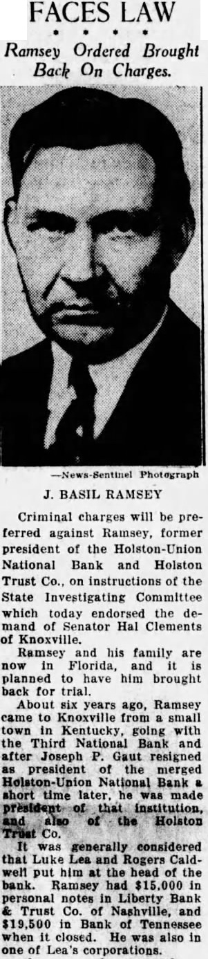 Criminal charges will be preferred against Ramsey, former president of the National Bank and Holston Trust Co., on instructions of the State Investigating Committee which today endorsed the demand of Senator Hal Clements of Knoxville. Ramsey and his family are Florida, and planned have him brought back for trial. About six years ago, Ramsey came to Knoxville from small town Kentucky, going with the Third National Bank and after Joseph Gaut resigned president of the merged National Bank short time later. he made the Holston generally considered that Luke Rogers Caldwell put him at the head the bank. Ramsey had personal notes Liberty Bank Trust Co. Nashville, and $19,500 Bank of Tennessee when closed. He also in one