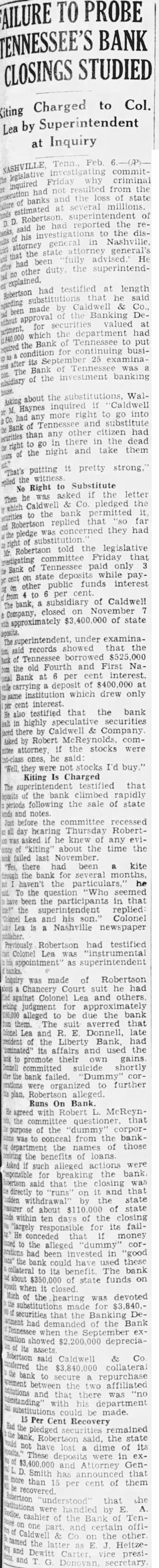 "That's putting it pretty strong," the witness mplied No Right to Substitute Then he was asked if the letter which Caldwell Co. pledged the securities the bank permitted it, Robertson replied that 'so far the pledge was concerned they had Mr. right Robertson told the legislative irrestigating committee Friday that Bank of Tennessee paid only 3 of cent on state deposits while payon other public funds interest per from The bank, to subsidiary of Caldwell Company, closed on November rith approximately 400,000 of state said records showed that the of Tennessee borrowed $525,000 im the old Fourth and First Namal Bank at per cent interest. carrying deposit of $400 000 at same institution which drew only cent interest. also testified that the bank all highly speculative securities there by Caldwell & Company Asked Robert McReynolds comnitee attorney. if the stocks were ones, he Well, they were not stocks I'd buy. Kiting Is Charged The testified that deposits of the bank climbed rapidly periods following the sale of state Just before the committee recessed all day hearing Thursday Robertasked if he knew of any eviinte "kiting' about the time the failed last "Yes, there had been a kite trough the bank for several months, aid. To the question "Who seemed have been the participants in that be!" the superintendent replied Colonel Lea and his son. Colonel Lea is a Nashville newspaper Previously Robertson had testified at Colonel Lea was "instrumental appointment" as superintendent Inquiry was made of Robertson about Chancery Court suit he had against Colonel Lea and others etcing judgment for approximately 160,000 alleged to be due the bank him them. The suit averred that Colonel Lea and R. E. Donnell, late resident of the Liberty Bank, had iminated" its affairs and used the promote their own gains Donnell committed suicide shortly bank failed. "Dummy corwations were organized to further is plan, Robertson alleged. Runs On Bank He agreed with Robert L. McReynrids, the committee questioner, that purpose of the "dummy corporlitte was conceal from the bankdepartment the names of those reiving the benefits of loans Asked if such alleged actions were responsible for breaking the bank Robertson said that the closing was directly to "runs" on it and that udden withdrawal' by the state masurer of about $110,000 of state ttds within ten days of the closing "largely responsible for its failHe conceded that if money laned the alleged "dummy" corprations had been invested in "good ans" the bank could have used these collateral to its benefit The bank about $350,000 of state funds on when Much of the hearing was devoted substitutions made for $3,840,securities that the Banking Deariment had demanded of the Bank Tennessee when the September exmination showed $2,200,000 depreciaassets Robertson said Caldwell & Co masferred the $3,840,000 collateral the bank to secure a repurchase stement between the two affiliated atitutions and that there was "no merstanding" with his department substitutions be made. 15 Per Cent Recovery Had the pledged remained said, the state vould not have lost dime of its These deposits were in ex$3,400 and Attorney GenSmith has announced that more than 15 per cent of them Robertson "understood" that the institutions were by E. A. sodioe, cashier of the Bank Tenone part and certain offiCaldwell & Co. on the other named the latter as E. J. Heitzeand Dewitt Carter, vice presiand Donovan, secretary
