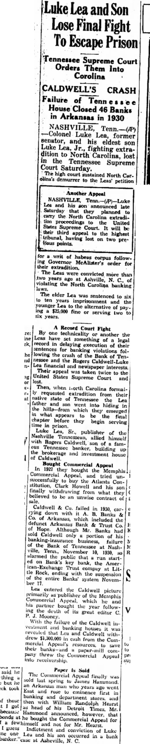 A Record Court Fight By one technicality or another the Leas have set something of legal record in delaying execution of their sentences for banking violations following the crash of the Bank of Tennessee and the Rogers Caldwell-Luke Lea financial and newspaper interests. Their appeal was taken twice to the United States Supreme Court and Then, when 1.orth Carolina formalrequested extradition from their native state of Tennessee the Lea father and son went into hiding in the which they emerged what appears to be the final chapter before they begin serving time in prison. Luke Lea, Sr., publisher of the Nashville Tennessean, allied himself with Rogers Caldwell, son of famous Tennessee banker, building up the brokerage and investment house Bought Commercial Appeal In 1927 they bought the Memphis Commercial Appeal, and tried unsuccessfully buy the Atlanta Constitution, Clark Howell and his son finally withdrawing from what they believed to be an unwise contract Caldwell & Co. failed in 1930, carrying down with Banks Co. of Arkansas, which included the defunct Arkansas Bank Trust Co. Although Mr. Banks had Caldwell only portion of his business, failure the Bank of Tennessee Nashville, Tenn., November 10, 1930, alarmed the public that run started on Bank's key bank, the American-Exchange Trust compay at Little Rock, ending with the suspension the entire Banks' system NovemLea entered the Caldwell picture primarily publisher the Memphis Commercial Appeal, which he and his partner bought the year followthe death of its great editor C. Mooney. With the failure of the Caldwell investment and banking houses was revealed that Lea and Caldwell withdrew $1,300,000 in cash from the Commercial Appeal's to save their paper-mill company threw the Commercial Appeal into receivership.