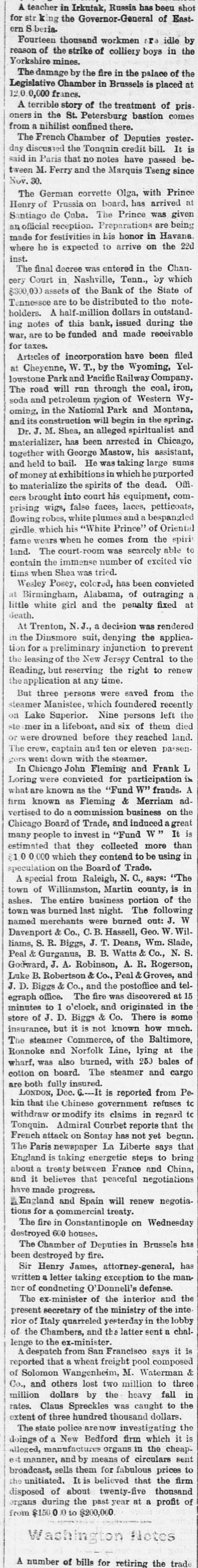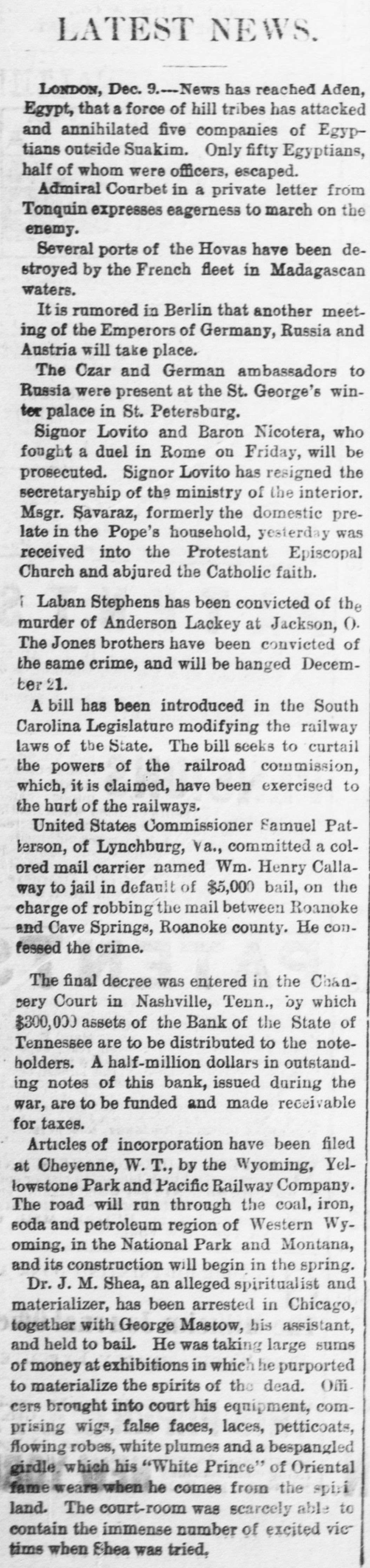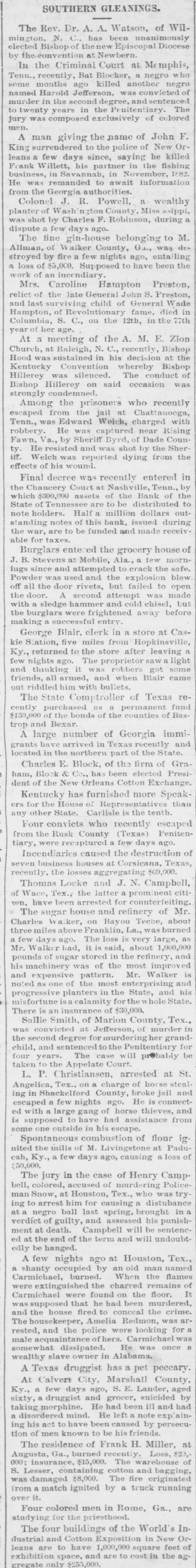 SOUTHERN GLEANINGS. The Rev. Dr. A. A. Watson, of Wilmington, N. C., has been unanimously elected Bishop of the new Episcopal Diocese by the.convention at Newbern. In the Criminal Court at Memphis, Tenn. recently, Bat Blocker, a negro who some months ago killed another negro named Harold Jefferson, was convicted of murder in the second degree, and sentenced to twenty years in the Penitentiary. The jury was composed exclusively of colored men. A man giving the name of John F. King surrendered to the police of New Orleans a few days since, saying he killed Frank Willett, his partner in the fishing business, in Savannah, in Nov ember, 1882. He was remanded to await information from the Georgia authorities. Colonel J. R. Powell, a wealthy planter of Wash nzton County, Miss ssippi, as shot by Charles F. Robinson, during a dispute few days ago. The fine gin-house belonging to M. Allman, of Walker County, Gu. was destroyed by fire a few nights ago, entailing loss of $5,000. Supposed to have been the work of an incendiary. Mrs. Caroline Hampton Preston, reliet of the late General John S. Preston, and last surviving child of General Wade Hampton, of Revolutionary fame, died in Columbia, S. C., on the 12th, in the 77th year of her age. At a meeting of the A. M. E. Zion Church, at Raleigh, N. C., recently, Bishop Hood was sustained in his decision at the Kentucky Convention whereby Bishop Hillerey was silenced. The conduct of Bishop Hillerey on said occasion was strongly condemned. Among the prisoners who recently escaped from the jail at Chattanooga, Tenn., was Edward Welch, charged with robbery. He was captured near Rising Fawn, Va., by Sheriff Byrd, of Dade County He resisted and was shot by the Sheriff. Welch was reported dying from the effects of his wound. Final decree was recently entered in the Chancery Court at Nashvill le, Tenn., by which $300,000 assets of the Bank of the State of Tennessee are to be distributed to note holders. Half million dollars outstanding notes of this bank, issued during the war, are to be funded and made receivable for taxes. Burglars ente: ed the grocery house of J. B. Stevens at Mobile, Ala., a few mornings since and attempted to crack the safe. Powder was used and the explosion blew off all the door rivets, but failed to open the door. A second attempt was made with sledge hammer and cold chisel, but the burglars were frightened away before making successful entry. George Blair, clerk in a store at Caskie Station, five miles from Hopkinsville, Ky., returned to the store after leaving a few nights ago. The proprietor saw light and thinking it was robbers got some friends, all armed, and when Blair came out riddled him with bullets. The State Comptroller of Texas recently purchased as a fund $130,000 of the bonds of the counties of Bastrop and Bexar A large number of Georgia immigrants have arrived in Texas recently and located in the northern part of the State. Charles E. Block, of the firm of Graham, Block & Co., has been elected President of the New Orleans Cotton Exchange. Kentucky has furnished more Speakers for the House of Representatives than any other State. Carlisle is the tenth. Four convicts who recently escaped from the Rusk County (Texas) Penitentiary, were recaptured a few days ago. Incendiaries caused the destruction of seven business houses at Corsicana, Texas, recently. the losses aggregating $69,000. Thomas Locke and J. N. Campbell, of Wacc, Tex., the latter a prominent citi zen. have been arrested for counterfeiting. The sugar house and refinery of Mr. Charles Walker, on Bayou Teche, about three miles above Franklin, La., was burned a few days ago. The loss is very large, as Mr. Walker had, it is said, about 1,000,000 pounds of sugar stored in the refinery, and his machinery was of the most improved and expensive pattern. Mr. Walker is noted as one of the most enterprising and progressive planters in the State, and his misfortune is calamity for the hole State. There is an insurance of $30,000. Sallie Smith, of Marion County, Tex., was convicted at Jefferson, of murder the second degree for murdering her grandchild, and sentenced to the Penitentiary for four years. The case will probably be taken to the Appelate Court. L. P. Christiansen, arrested at St. Angelica, Tex., on a charge of horse stealing in Shackelford County, broke jail and escaped a few nights ago. He is connected with large gang of horse thieves, and is supposed to have had assistance from some one outside in his escape. Spontaneous combustion of flour ig nited the mills of M. Livingstone at Paducah, Kv. a few days ago, causing a loss of £50,000. The jury in the case of Henry Campbell, colored, accused of murdering Policeman Snow, at Houston, Tex., who was trying to arrest him for causing a distubance a negro ball last spring, brought in verdict of guilty, and assessed his punishment at death. Campbell will be sentenced at the end of the term and will undoubtedly be hanged. A few nights ago at Houston, Tex., a shanty occupied by an old man named Carmichael, burned. When the flames were extinguished the charred remains of It Carmichael were found on the floor. was supposed that he had been murdered, and the house fired to conceal the crime. The housekeeper, Amelia Redmon, was arrested, and the police were looking for 8 male acquaintance of hers. Carmichael was once somewhat dissipated. He was wealthy slave owner in Alabama. A Texas druggist has a pet peccary. At Calvert City, Marshall County, Ky., a few days ago, S. E. Lander, aged sixty a druggist and grocer, suicided by taking morphine. He had been ill and had a disordered mind. He left a note explaining his act to have been caused by persecution of men known to be his friends. The residence of Frank H. Miller, at Augusta, Ga., burned recently. Loss, $20, 000; insurance, $15,000. The arehouse of S. Lesser, containing cotton and bagging, was damaged $8,000. The fire originated from match ignited by a truck running over it. Fou
