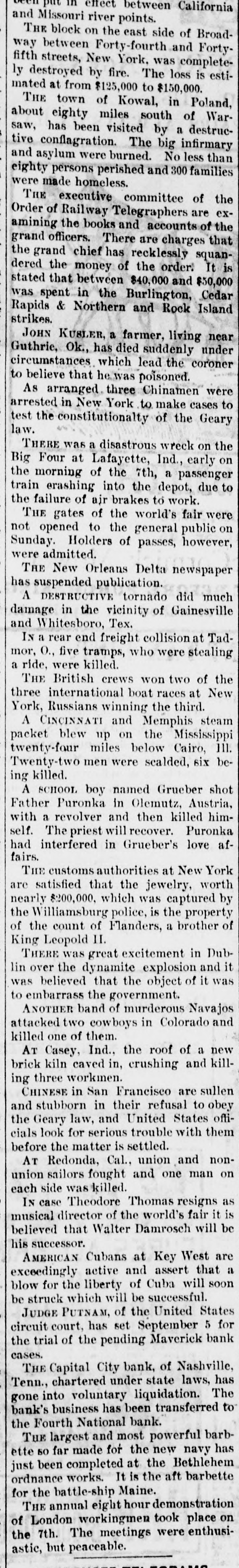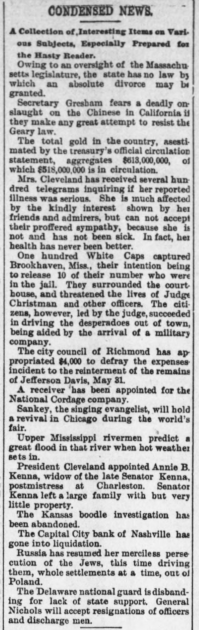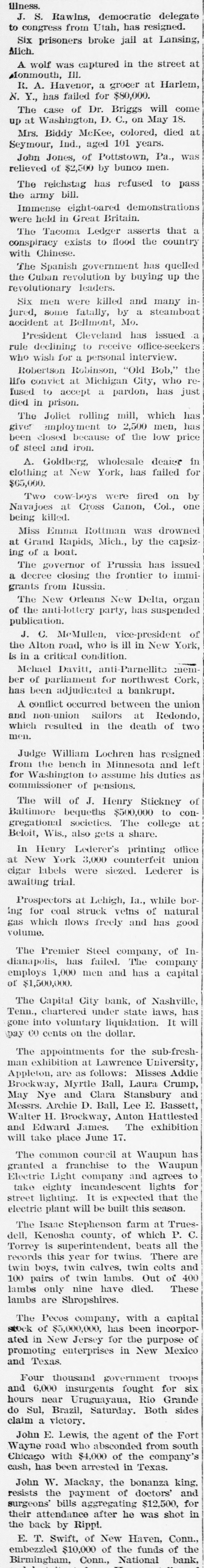 illness. J. S. Rawlns, democratic delegate to congress from Utah, has resigned. Six prisoners broke jail at Lansing, Mich A wolf was captured in the street at Monmouth, III. R. A. Havenor, a grocer at Harlem, N. Y., has failed for $80,000. The case of Dr. Briggs will come up D. C., on 18. at Mrs. at Washington, Biddy McKee, colored, May died Seymour, Ind., aged 101 years. John Jones, of Pottstown, Pa., was relieved of $2,500 by bunco men. The reichstag has refused to pass the army bill. Immense eight-oared demonstrations were held in Great Britain, The Tacoma Ledger asserts that a conspiracy exists to flood the country with Chinese. The Spanish government has quelled the Cuban revolution by buying up the revolutionary leaders. Six men were killed and many injured, some fatally, by a steamboat accident at Bellmont, Mo. President Cleveland has issued a rule declining to receive office-seekers who wish for a personal interview. Robertson Robinson, "Old Bob," the life convict at Michigan City, who relused to accept a pardon, has just died in prison. The Joliet rolling mill, which has to 2,500 has because of the low been given closed employment men, price of steel and iron. A. Goldberg, wholesale dealer in clothing at New York, has failed for $65,000. Two cow-boys were fired on by Navajoes at Cross Canon, Col., one being killed. Rottman was Miss Grand Emma drowned at Rapids, Mich., by the capsizing of a boat. The governor of Prussia has issued a decree closing the frontier to immigrants from Russia. Orleans New The the New Delta, organ of anti-lottery party, has suspended publication. J. C. McMullen, vice-president of the Alton road, who is ill in New York, Is in a critical condition. Mchael Davitt, anti-Parnellito member of parliament for northwest Cork, has been adjudicated a bankrupt. A conflict occurred between the union and non-union sailors at Redondo, which resulted in the death of two men. Judge William Lochren has resigned from the bench in Minnesota and left for Washington to assume his duties as commissioner of pensions. The will of J. Henry Stickney of bequeths $500,000 Baltimore gregational to consocieties. The college at Beloit, Wis., also gets a share. In Henry Lederer's printing office at New York 3,000 counterfeit union cigar labels were siezed. Lederer is awaiting trial. Prospectors at Lehigh, Ia., while boring for coal struck veins of natural gas which flows freely and has good volume. The Premier Steel company, of Indianapolis, has failed. The company employs 1,000 men and has a capital of $1,500,000. The Capital City bank, of Nashville, Tenn., chartered under state laws, has gone into voluntary liquidation. It will pay 60 cents on the dollar. The appointments for the sub-freshman exhibition at Lawrence University, Appleton, are as follows: Misses Addie Myrtle Ball, Laura and Lee Messrs. May Brockway, Nye Archie and D. Clara Ball, Stansbury E. Bassett, Crump, Walter H. Brockway, Anton Hattlested and Edward James. The exhibition will take place June 17. The common council at Waupun has granted a franchise to the Waupun Electric Light company and agrees to take eighty incandescent lights for street lighting. It is expected that the electric plant will be built this season. The Isaac Stephenson farm at Truesdell, Kenosha county, of which P. C. Torrey is superintendent, beats all the records this year for twins. There are twin boys, twin calves, twin colts and 100 pairs of twin lambs. Out or 400 lambs only nine have died. These lambs are Shropshires. The Pecos company, with a capital stock of $5,000,000, has been incorporated in New Jersey for the purpose of promoting enterprises in New Mexico and Texas. Four thousand government troops and 6,000 insurgents fought for six hours near Uruguayaua, Rio Grande do Sul, Brazil, Saturday. Both sides claim a victory. John E. Lewis, the agent of the Fort Wayne road who absconded from south Chicago with $4,000 of the company's cash, has been arrested in Texas. John W. Mackay, the bonanza king, resists the payment of doctors' and surgeons' bills aggregating $12,500, for their attendance after he was shot in the back by Rippi. T. of New of the the embezzled E. Swift, $10,000 Haven, funds of Conn., Birmingham, Conn., National bank,