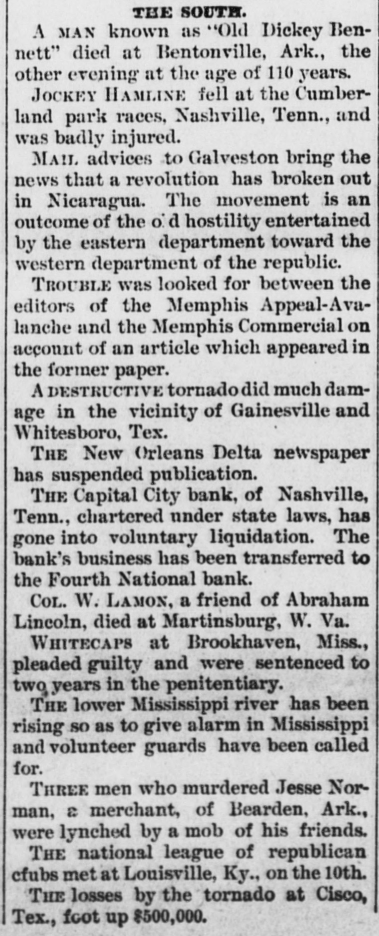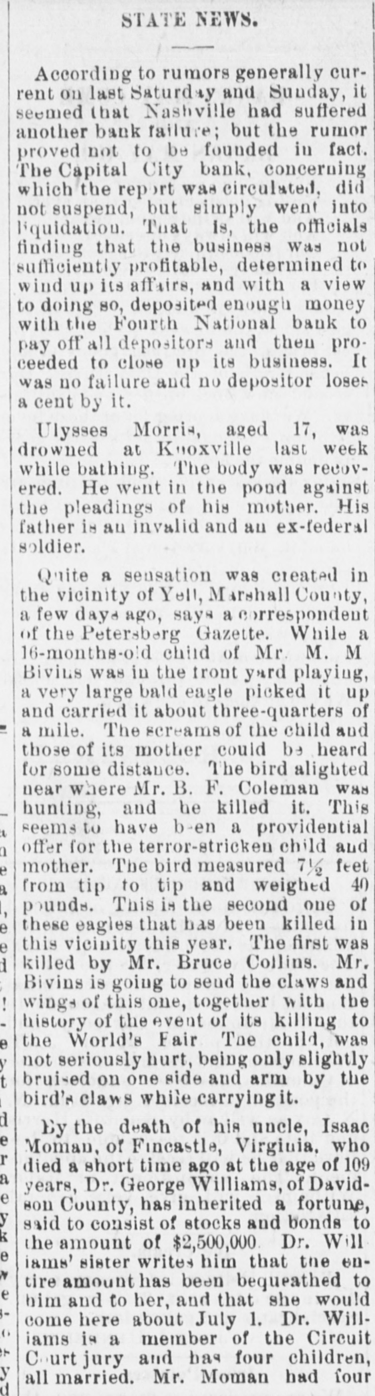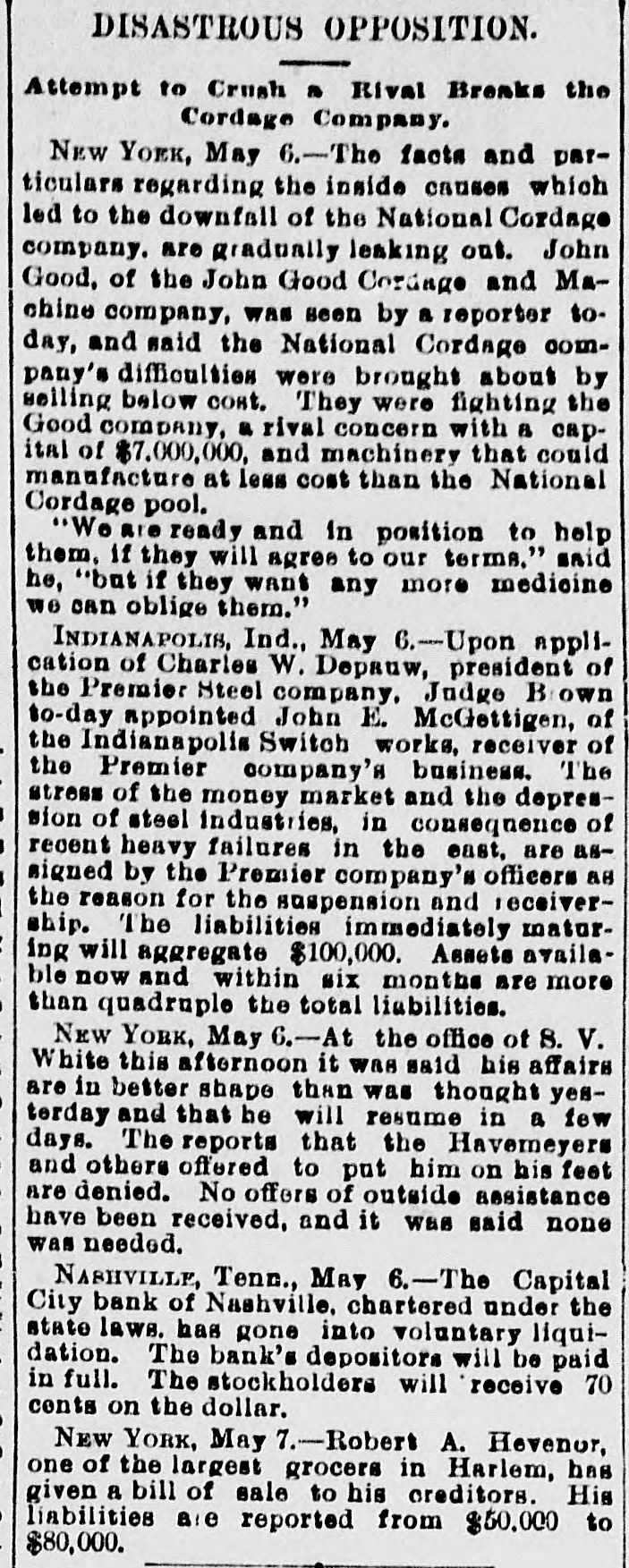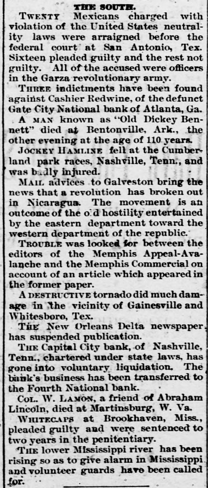 illness. J. S. Rawlns, democratic delegate to congress from Utah, has resigned. Six prisoners broke jail at Lansing, Mich A wolf was captured in the street at Monmouth, III. R. A. Havenor, a grocer at Harlem, N. Y., has failed for $80,000. The case of Dr. Briggs will come up D. C., on 18. at Mrs. at Washington, Biddy McKee, colored, May died Seymour, Ind., aged 101 years. John Jones, of Pottstown, Pa., was relieved of $2,500 by bunco men. The reichstag has refused to pass the army bill. Immense eight-oared demonstrations were held in Great Britain, The Tacoma Ledger asserts that a conspiracy exists to flood the country with Chinese. The Spanish government has quelled the Cuban revolution by buying up the revolutionary leaders. Six men were killed and many injured, some fatally, by a steamboat accident at Bellmont, Mo. President Cleveland has issued a rule declining to receive office-seekers who wish for a personal interview. Robertson Robinson, "Old Bob," the life convict at Michigan City, who relused to accept a pardon, has just died in prison. The Joliet rolling mill, which has to 2,500 has because of the low been given closed employment men, price of steel and iron. A. Goldberg, wholesale dealer in clothing at New York, has failed for $65,000. Two cow-boys were fired on by Navajoes at Cross Canon, Col., one being killed. Rottman was Miss Grand Emma drowned at Rapids, Mich., by the capsizing of a boat. The governor of Prussia has issued a decree closing the frontier to immigrants from Russia. Orleans New The the New Delta, organ of anti-lottery party, has suspended publication. J. C. McMullen, vice-president of the Alton road, who is ill in New York, Is in a critical condition. Mchael Davitt, anti-Parnellito member of parliament for northwest Cork, has been adjudicated a bankrupt. A conflict occurred between the union and non-union sailors at Redondo, which resulted in the death of two men. Judge William Lochren has resigned from the bench in Minnesota and left for Washington to assume his duties as commissioner of pensions. The will of J. Henry Stickney of bequeths $500,000 Baltimore gregational to consocieties. The college at Beloit, Wis., also gets a share. In Henry Lederer's printing office at New York 3,000 counterfeit union cigar labels were siezed. Lederer is awaiting trial. Prospectors at Lehigh, Ia., while boring for coal struck veins of natural gas which flows freely and has good volume. The Premier Steel company, of Indianapolis, has failed. The company employs 1,000 men and has a capital of $1,500,000. The Capital City bank, of Nashville, Tenn., chartered under state laws, has gone into voluntary liquidation. It will pay 60 cents on the dollar. The appointments for the sub-freshman exhibition at Lawrence University, Appleton, are as follows: Misses Addie Myrtle Ball, Laura and Lee Messrs. May Brockway, Nye Archie and D. Clara Ball, Stansbury E. Bassett, Crump, Walter H. Brockway, Anton Hattlested and Edward James. The exhibition will take place June 17. The common council at Waupun has granted a franchise to the Waupun Electric Light company and agrees to take eighty incandescent lights for street lighting. It is expected that the electric plant will be built this season. The Isaac Stephenson farm at Truesdell, Kenosha county, of which P. C. Torrey is superintendent, beats all the records this year for twins. There are twin boys, twin calves, twin colts and 100 pairs of twin lambs. Out or 400 lambs only nine have died. These lambs are Shropshires. The Pecos company, with a capital stock of $5,000,000, has been incorporated in New Jersey for the purpose of promoting enterprises in New Mexico and Texas. Four thousand government troops and 6,000 insurgents fought for six hours near Uruguayaua, Rio Grande do Sul, Brazil, Saturday. Both sides claim a victory. John E. Lewis, the agent of the Fort Wayne road who absconded from south Chicago with $4,000 of the company's cash, has been arrested in Texas. John W. Mackay, the bonanza king, resists the payment of doctors' and surgeons' bills aggregating $12,500, for their attendance after he was shot in the back by Rippi. T. of New of the the embezzled E. Swift, $10,000 Haven, funds of Conn., Birmingham, Conn., National bank,