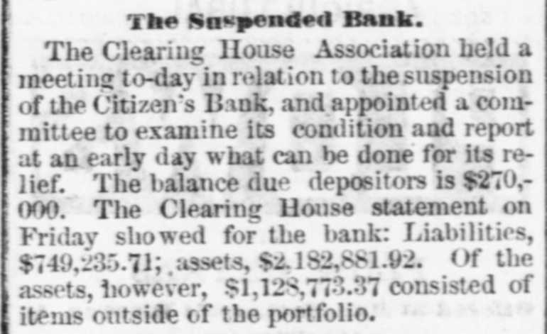 The Suspended Bank. The Clearing House Association held a meeting to-day in relation to the suspension of the Citizen's Bank, and appointed a committee to examine its condition and report at an early day what can be done for its relief. The balance due depositors is $270,000. The Clearing House statement on Friday showed for the bank: Liabilities, $749,235.71; assets, $2,182,881.92. Of the assets, however, $1,128,773.37 consisted of items outside of the portfolio.