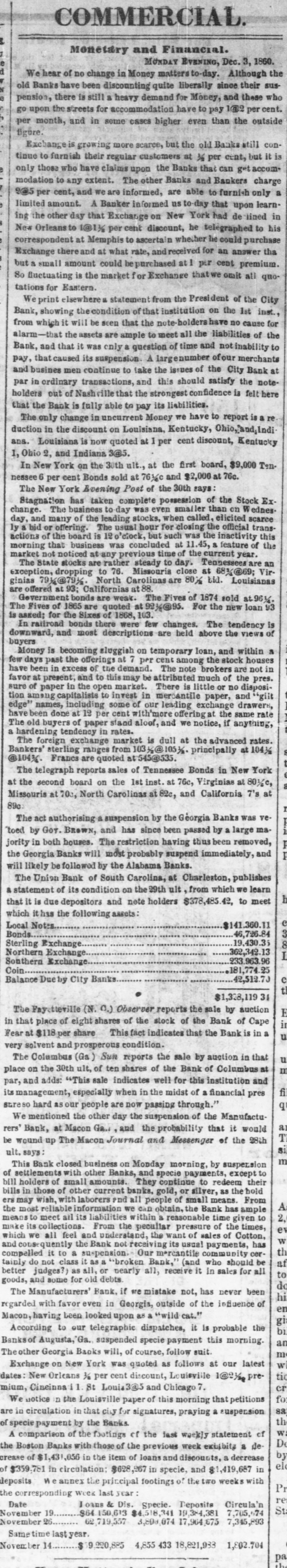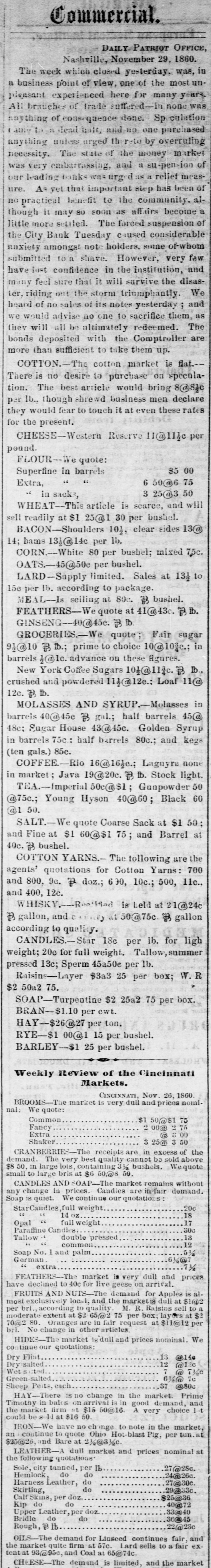 DAILY PATRIOT OFFICE, Nashville, November 29, 1860. The week which closed yesterday, was, in a business point of view, one of the most unpleasant experienced here for many years. All brauches of trade suffered-in none was knything of consequence done. culation I any to a dead halt, and-no one purchased anything unless urged th reto by overruling necessity. The state of the money in arket was very embarrassing, and a suspension of our leading banks was d a relief measure. As yet that important step has been of no practical benefit to the community, although it may S0 soon as affairs become a little more settled. The forced suspension of the City Bank Tuesday caused considerable nnxiety amongst note holders, some of-whom submitted to a shave. However, very few have lost confidence in the institution, and many feel sure that it will survive the disaster, riding out the storm triumphantly. We heard of no sales of its notes yesterday and we would advise no one to sacrifice them, as they will all be ultimately redeemed. The bonds deposited with the Comptroller are more than sufficient to take them up. COTTON.-The cotton market is flat.-There no desire to purchase on speculation. The best article would bring 8@8lc per 1b., though shrewd business men declare they would fear to touch it at even these rates for the present. CHEESE-Western Reserve 11@11}c per pound. FLOUR--We quote: $5 00 Superfine in barrels " Extra, 6 50@6 75 in sacks, 3 25@3 50 WHEAT--This article is scarce, and will sell readily at $1 25@1 30 per bushel. BACON-Shoulders 101, clear sides 13@ 14; bams 13}@14c per lb. CORN.-White 80 per bushel; mixed 7,5c. OATS.45@50e per bushel. LARD-Supply limited. Sales at 131 to 15c per 1b. according to package. MEAL-1s selling at 80c. B bushel. FEATHERS-We quote at 41@43c. B. GINSENG-40@45e. B lb GROCERIES.-We quote; Fair sugar 9}@10 B lb.; prime to choice 10@10śc.; in barrels 1@1c. advance on these Agures. New York Coffee Sugars 10}@11śc. lb., crushed and powdered 11}@12c.: Loaf 12c. B lb. MOLASSES AND SYRUP.-Molasses in barrels 40@45e B gal.; half barrels 45@ 48c; Sugar House 43@45c. Golden Syrup in barrels 75c.: half barrels 80c.; and kegs (ten gals.) 85c. COFFEE.-Rio 16@16}c.; Laguyra none in market; Java 19@20c. B lb. Stock light. TEA.-Imperial 50c@$1 Gunpowder 50 @75c.; Young Hyson 40@60; Black 60 @1 50. SALT.-We quote Coarse Sack at $1 50; and Fine at $1 60@$1 75; and Barrel at 40c. B bushel. COTTON YARNS.- The following are the agents' quotations for Cotton Yarns: 700 and 800, 9c. P doz.; 6 90, 10c.; 500, 11c., and 400, 12c. WHISKY.-R4ad is held at 21@24c B gallon, and at 50@75c. B gallon according to quality. CANDLES.-Star 18c per lb. for ligh weight; 20c for full weight. Tallow,summer pressed 13c; Sperm 45a50e per 1b. Raisins-Layer $3a3 25 per box; W. R $2 50a2 75. SOAP-Turpentine $2 25a2 75 per box. BRAN-$1.10 per cwt. HAY-$26@27 per ton. RYE-$1 00@1 15 per bushel. BARLEY-$1 25 per bushel. Weekly Review of the Cincinnati Markets. CINCINNATI, Nov. 26, 1860 BROOMS-The market is very dull and prices nomi nal: We quote: Common $1 50@$1 75 Fancy 2 00@ 276 Extra @ 3 00 00 Shaker 3 25@ 50 CRANBERRIES-The receipts are in excess of the demand. The very best quality cannot be sold above $8 50, in large lots containing 3½ bushels. Wequote small to large bris at $6 50,@8 50. CANDLES AND SOAP-The market remains without any change in prices. Candles are in-fair demand. Soap is quiet. We continue our quotations 20c StarCandles full weight 14 18 17 Opal " full weight 30c Paraffine Candles. 13 Tallow double pressed 12 common Soap No. and palm 5½ German 61/2@7 extra ½ FEATHERS-The market is very dull and prices have declined to 40c for live geese on arrival. FRUITS AND NUTS-The demand for Apples is almost exclusively local, and the marketis dull at $1@2 per brl according to quality M. R. Raisins sell to a moderate extent at $2 65@2 75 per box: layers at $2 70@2 80. Oranges are in fair request at $11@12 per brl. No change in other articles HIDES-The market is dull and prices nominal. We continue our quotations: Dry Flint 13 @14e 12 @13c Dry salted Wet ted @ 71/20 Green salted %@ To Sheep Peits, each 37 @80c HAY-There is no change in the market. Prime Timothy in bales on arrival in good demand, and the market firm at $15 50@16. A very choice lt could be 8 at $16 50. IRON-We have no inge to note in the market, an continue to quote Ohio Hot-blast Pig, per tun at $25@26, and Bare at 2½@3%c. LEATHER-A dull market and prices nominal at the following quotations 27@2Sc. Sole, city tanned, per lb Hemlock do do 24@26c. 27@30c. Harness Leather, do do Skirting, 29@33c. Skins, per doz. $25@36 do Kip do 40@72 33@40 Upper Leather, per doz. Bridle do do 36@45 Rough, P lb 22@23c OILS-The demand for Linseed continues fair, and the market quite firm at 57c. Lard sells fair ex-