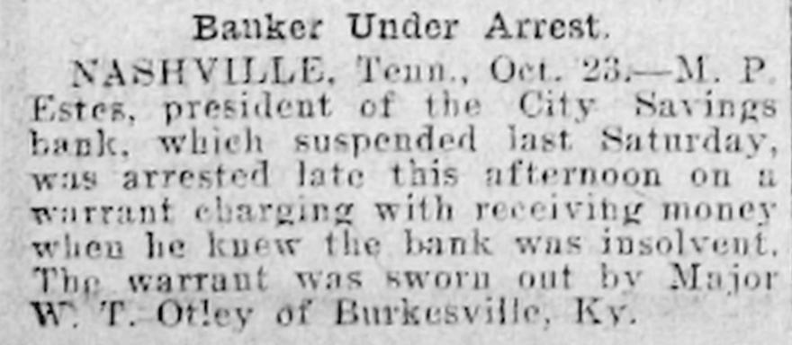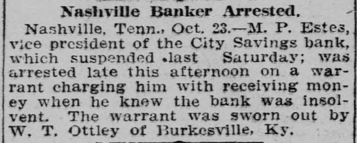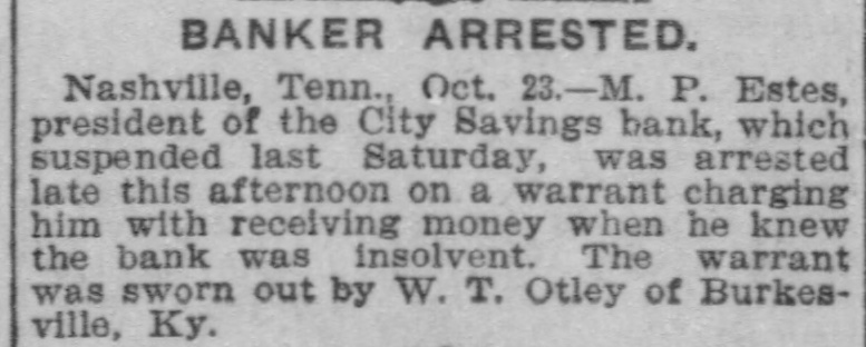 BANKER ARRESTED. Nashville, Tenn., Oct. 23.-M. P. Estes, president of the City Savings bank, which suspended last Saturday, was arrested late this afternoon on a warrant charging him with receiving money when he knew the bank was insolvent. The warrant was sworn out by W. T. Otley of Burkesville, Ky.