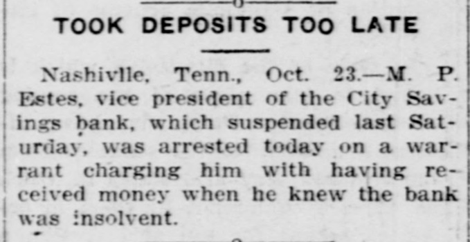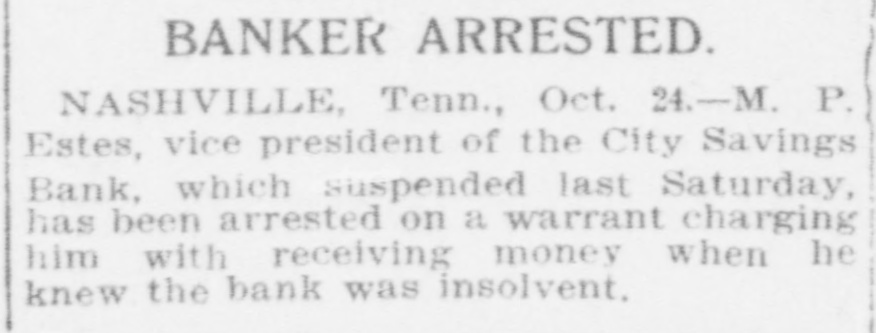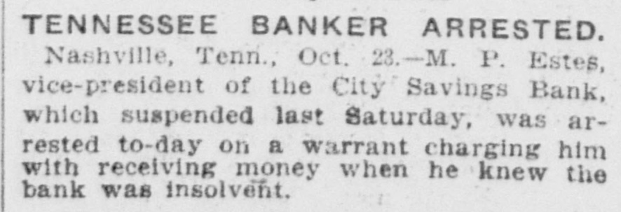 TENNESSEE BANKER ARRESTED. Nashville, Tenn., Oct. 23.-M. P. Estes, vice-president of the City Savings Bank, which suspended last Saturday, was arrested to-day on a warrant charging him with receiving money when he knew the bank was insolvent.