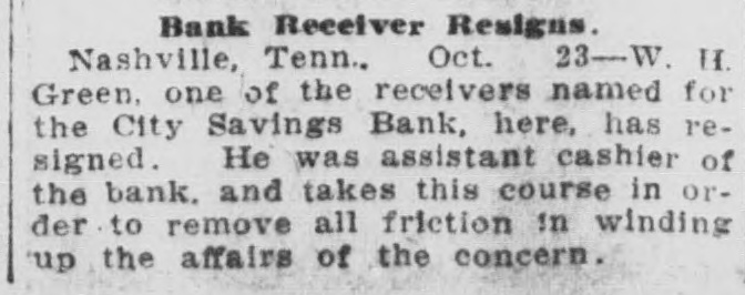 Bank Receiver Resigns. Nashville, Tenn., Oct. 23-W. H. Green, one of the receivers named for the City Savings Bank, here, has resigned. He was assistant cashier of the bank. and takes this course in order to remove all friction in winding up the affairs of the concern.