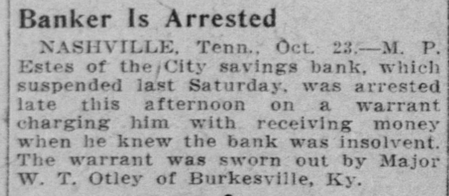 ESTES IS ARRESTED. Nashville, Tenn., Oct.. 23.-At. 3 o'clock this afternoon M. P. Estes, vice president of the City Savings Bank, which suspended last Saturday, was arrested on a warrant charging him with receiving money when he knew the bank was insolvent. The warnant was sworn out by W. L. Otley of Burkesville, Ky.