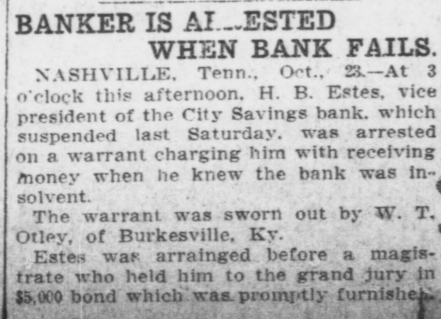 Nashville Banker Arrested. Nashville, Tenn., Oct. 23.-M. P. Estes, vice president of the City Savings bank, which suspended .last Saturday; was arrested late this afternoon on a warrant charging him with receiving money when he knew the bank was insolvent. The warrant was sworn out by W. T. Ottley of Burkesville, Ky.