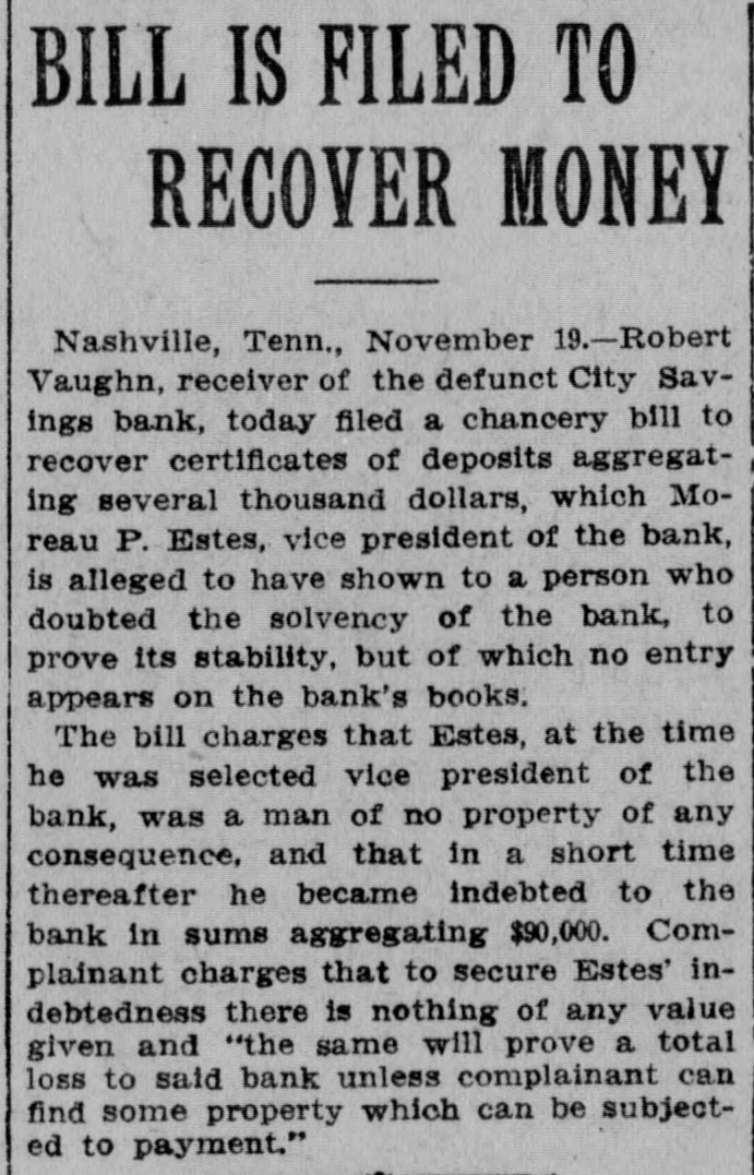 BILL IS FILED TO RECOVER MONEY Nashville, Tenn., November 19.-Robert Vaughn, receiver of the defunct City Savings bank, today filed a chancery bill to recover certificates of deposits aggregating several thousand dollars, which Moreau P. Estes, vice president of the bank, is alleged to have shown to a person who doubted the solvency of the bank, to prove its stability, but of which no entry appears on the bank's books. The bill charges that Estes, at the time he was selected vice president of the bank, was a man of no property of any consequence, and that in a short time thereafter he became indebted to the bank in sums aggregating $90,000. Complainant charges that to secure Estes' indebtedness there is nothing of any value given and "the same will prove a total loss to said bank unless complainant can find some property which can be subjected to payment."