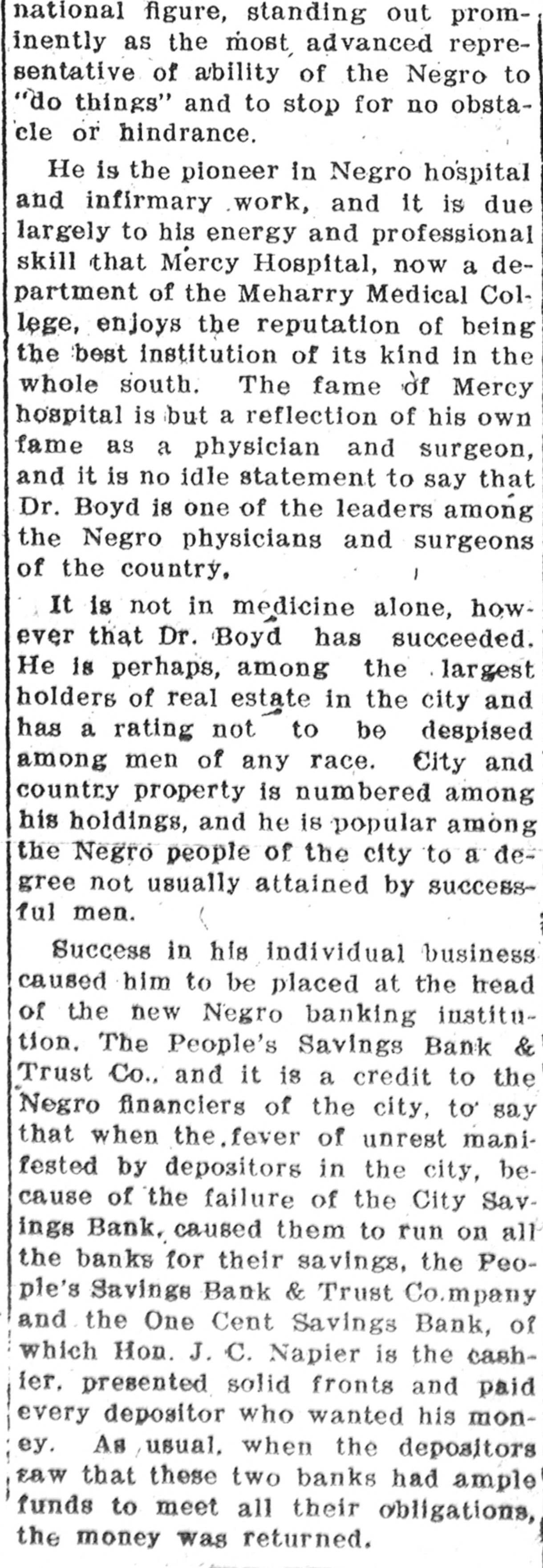 It is not in medicine alone, however that Dr. Boyd has succeeded. He is perhaps, among the largest holders of real estate in the city and has a rating not to be despised among men of any race. City and country property is numbered among his holdings, and he is popular among the Negro people of the city to a degree not usually attained by successful men.