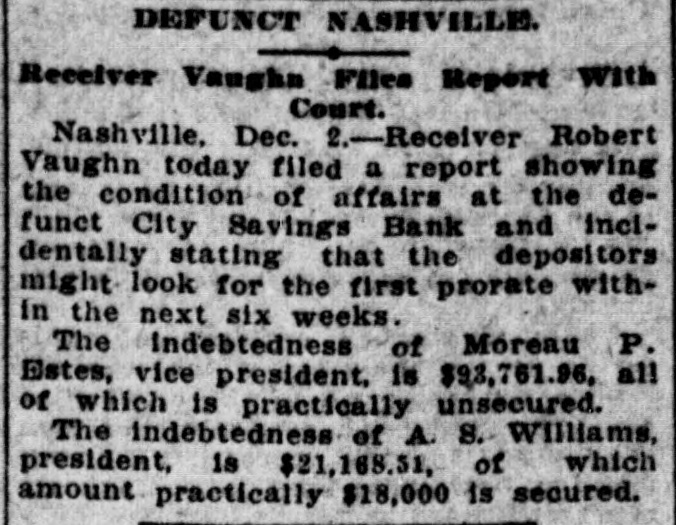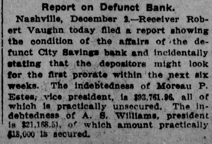 Report on Defunct Bank. Nashville, December 2.-Receiver Robert Vaughn today filed a report showing the condition of the affairs of the defunct City Savings bank and incidentally stating that the depositors might look for the first prorate within the next six weeks. The indebtedness of Moreau P. Estes, vice president, is $93,761.96, all of which is practically unsecured. The indebtedness of A. S. Williams, president is $21,168.51, of which amount practically $18,000 is secured.