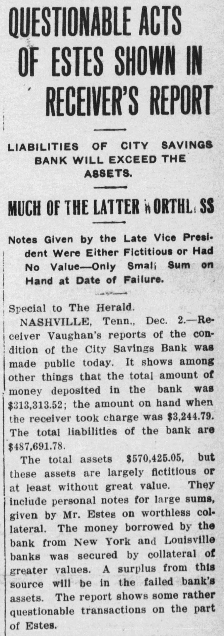 QUESTIONABLE ACTS OF ESTES SHOWN IN RECEIVER'S REPORT / LIABILITIES OF CITY SAVINGS BANK WILL EXCEED THE ASSETS. MUCH OF THE LATTER it ORTHL SS Notes Given by the Late Vice President Were Either Fictitious or Had No Value-Only Small Sum on Hand at Date of Failure. Special to The Herald. NASHVILLE, Tenn., Dec. 2.-Receiver Vaughan's reports of the condition of the City Savings Bank was made public today. It shows among other things that the total amount of money deposited in the bank was $313,313.52; the amount on hand when the receiver took charge was $3,244.79. The total liabilities of the bank are $487,691.78. The total assets $570,425.05, but these assets are largely fictitious or at least without great value. They include personal notes for large sums, given by Mr. Estes on worthless collateral. The money borrowed by the bank from New York and Louisville banks was secured by collateral of greater values. A surplus from this source will be in the failed bank's assets. The report shows some rather questionable transactions on the part of Estes.