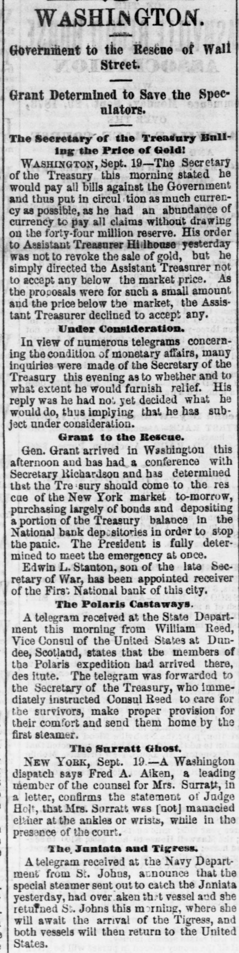 WASHINGTON Government to the Rescue of Wall Street. Grant Determined to Save the Speculators. The Secretary of the Treasury Balling the Price of Gold! WASHINGTON, Sept. 19-The Secretary of the Treasury this morning stated he would pay all bills against the Government and thus put in circul tion as much currency as possible, as he had an abundance of to all on the reserve. currency forty-four pay million claims without His drawing order to Assistant Treasurer Hillhouse yesterday was not to revoke the sale of gold, but he simply directed the Assistant Treasurer not to accept any below the market price. As the proposals were for such a small amount and the price below the market, the Assistant Treasurer declined to accept any. Under Consideration. In view of numerous telegrams concerning the condition of monetary affairs, many inquiries were made of the Secretary of the Treasury this evening as to whether and to what extent he would furnish relief. His reply was he had not yet decided what he would do, thus implying that he has subject under consideration. Grant to the Rescue. Gen. Grant arrived in Washington this afternoon and has had a conference with Secretary Richardson and has determined that the Tre sury should come to the res cue of the New York market to-morrow, purchasing largely of bonds and depositing a portion of the Treasury balance in the National bank depositories in order to stop the panic. The President is fully determined to meet the emergency at once. Edwin L. Stanton, son of the late Secretary of War, has been appointed receiver of the First National bank of this city. The Polaris Castaways. A telegram received at the State Department this morning from William Reed, Vice Consul of the United States at Dundee, Scotland, states that the members of the Polaris expedition had arrived there, des itute. The telegram was forwarded to the Secretary of the Treasury, who immediately instructed Consul Reed to care for the survivors, make proper provision for their comfort and send them home by the first steamer. The Surratt Ghost. NEW YORK, Sept. 19-A Washington dispatch says Fred A. Aiken, a leading member of the counsel for Mrs. Surratt, in that Was a Holt, letter, confirms Mrs. Sorratt the statement [not] manacied of Judge either at the ankles or wrists, while in the presence of the court. The Janiata and Tigress. A telegram received at the Navy Department from St. Johns, announce that the special steamer sent out to catch the Janiata yesterday, had over aken that vessel and she returned St. Johns this morning, where she will await the arrival of the Tigress, and both vessels will then return to the United States.