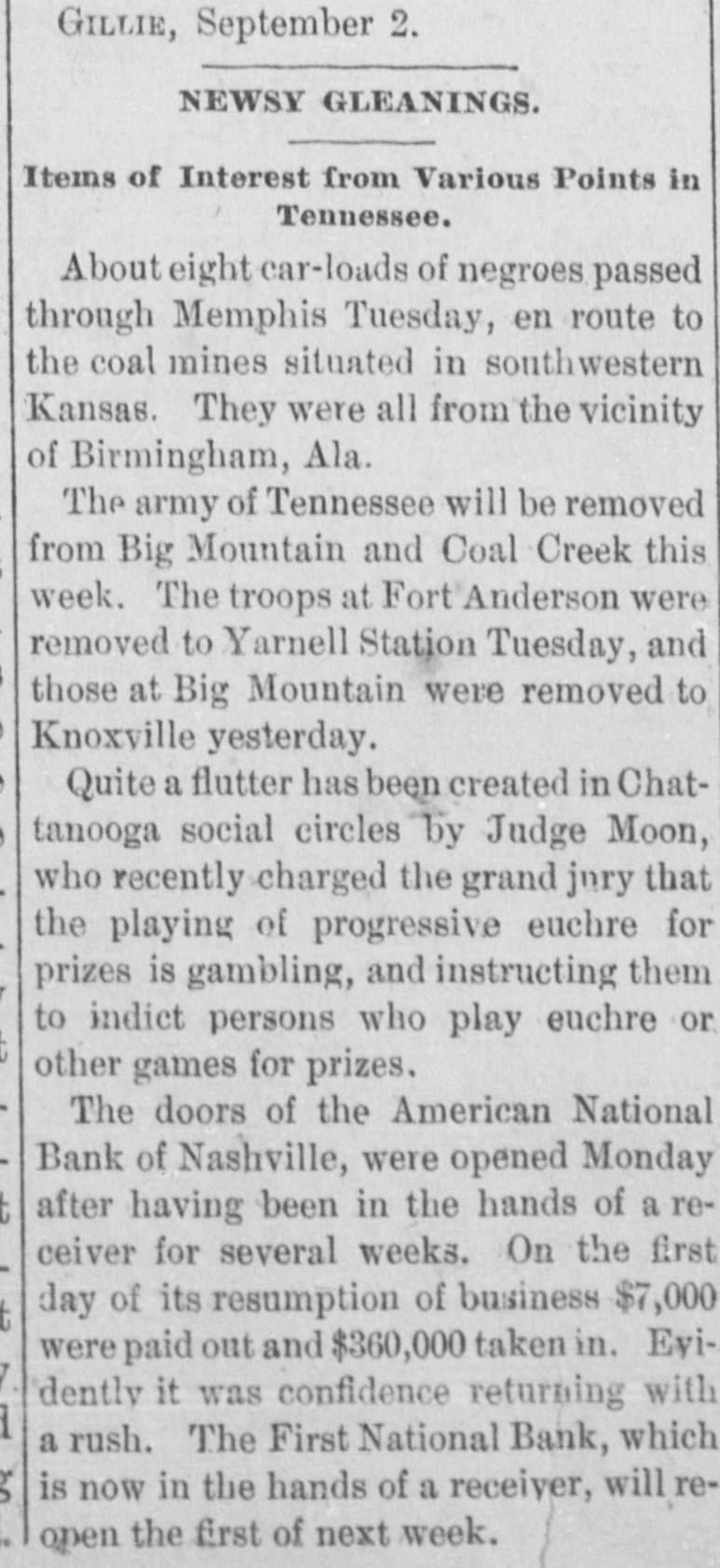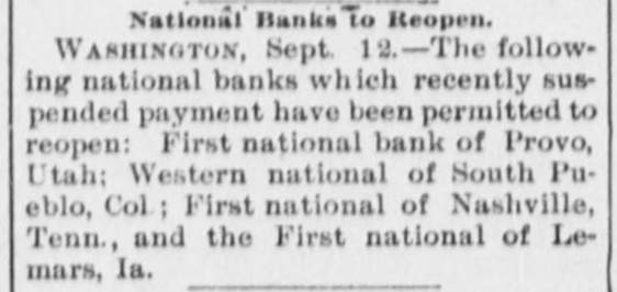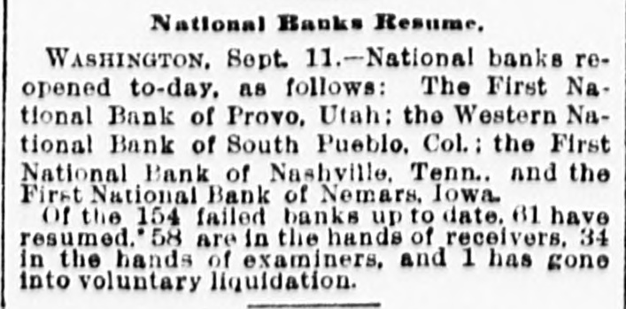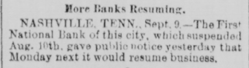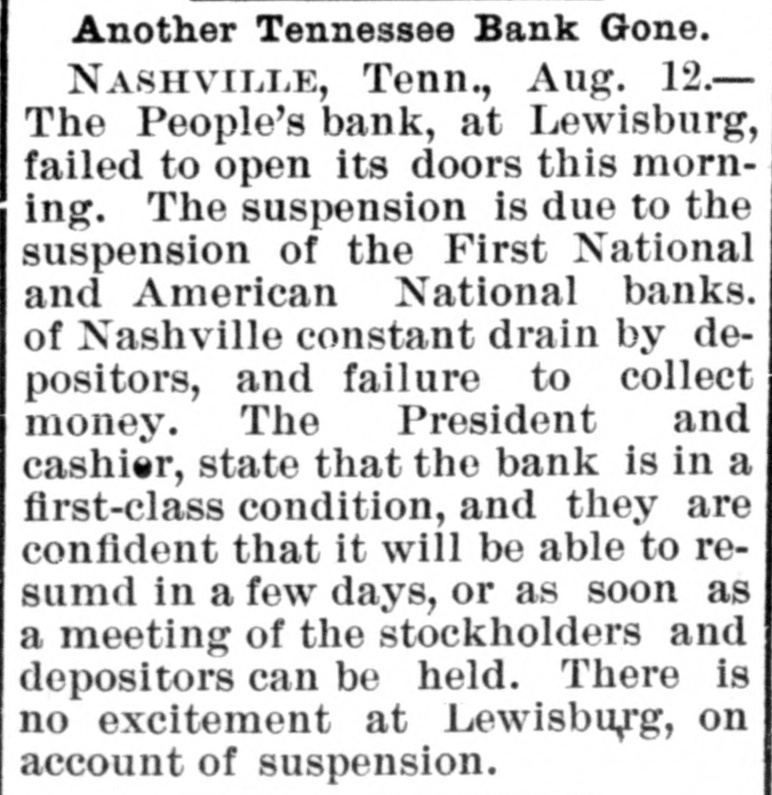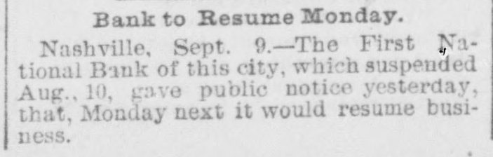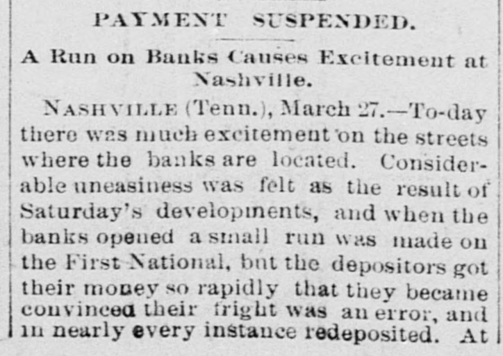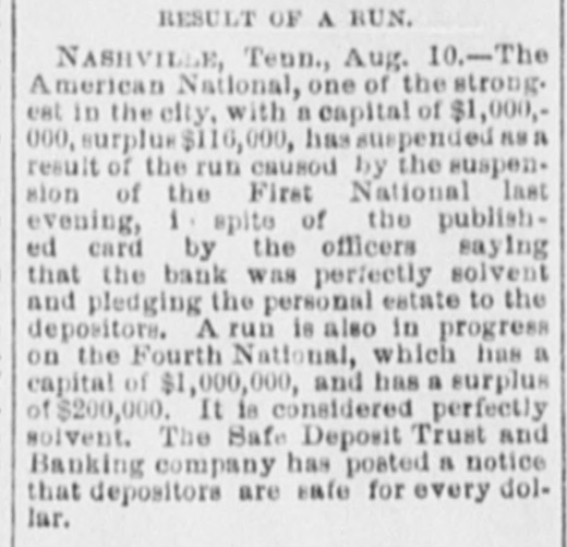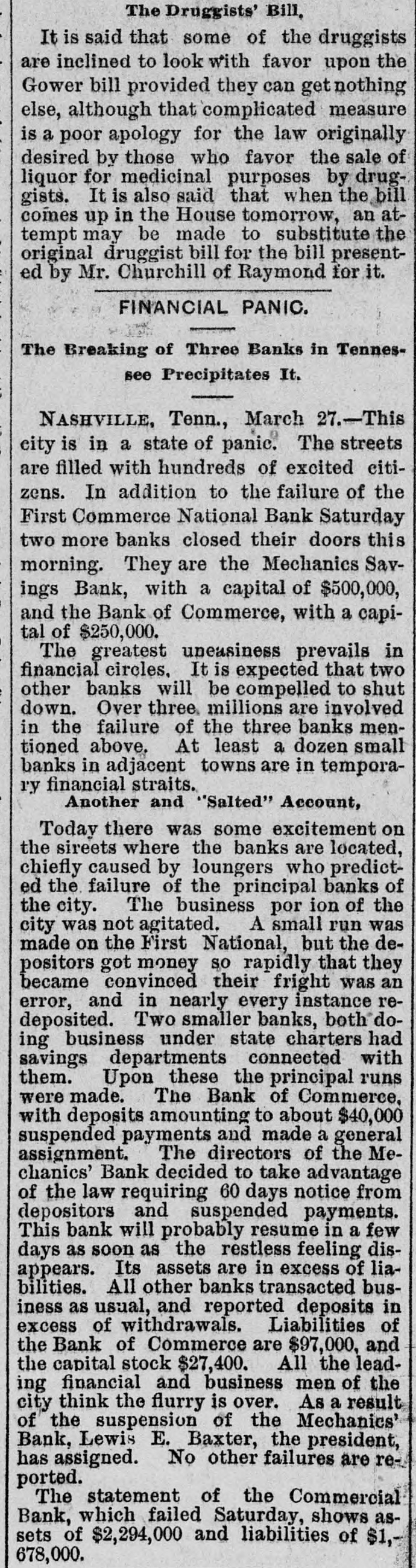 ANOTHER NASHVILLE FAILURE. THE BANK OF COMMERCE MAKES AN AS SIGNMENT THE MECHANICS' BANK DEMANDS SIXTY DAYS' NOTICE OF WITHDRAWAL OF DEPOSITSCREDITORS OF BOTH LIKELY TO GET THEIR MONEY - PRECAUTIONS AGAINST RUNS ON OTHER INSTITUTIONS. [BY TELEGRAPH TO THE TRIBUNE.] Nashville, Tenn., March 27.-The Bank of Commerce of this city did not open its doors to-day at 9 o'clock, the usual time: and an hour or two later, after a conference of the directors had been held, an assignment was made. John T. Lellyette was named as assignee. The bank was a small one, its assets and liabilities being approximately as follows: Assets-Notes discounted, $76,000; real estate and cash, $21,700; total, $97,700. Liabilities-Capital stock paid in. $27,500; deposits, savings account, $14,000; deposits, special account, $15,000; general deposits, $19,000; profit and loss, $22,200; total, $97,700. The Mechanics' Savings Bank and Trust Company, capital $250,000, took advantage of the State law permitting sixty days' notice to be demanded before deposits can be withdrawn. At least a dozen small banks in adjacent towns are said to Le in temporary financial straits. The assignment of the Bank of Commerce was filed late in the afternoon. The closing of the doors was brought about by an apprehension that a run on the bank would be made in the course of the day. Under the State Banking laws the bank could have required small depositors in the savings department to give sixty days' notice of their intention to withdraw deposits. This, however, would not have prevented the withdrawal of regular deposits, which would leave the small depositors at a disadvantage. The directors there. fore decided, in the interest of all depositors alike, to close the bank. The failure of certain persons, who owe the bank large sums, to meet these obligations was the principal cause of the suspension. None of the directors or officers of the bank are indebted to the institution. Mr. Brooks, the cashier, thinks the stockholders, as well as the depositors, will be paid in full if the amounts due the bank can be collected, and that if only 50 per cent of the indebtedness can be collected the depositors ought to get all that is due them. The suspension of the Commercial National Bank on Saturday afternoon occasioned considerable excitement, which had, however, quieted down by this morning, a change of feeling largely due to the belief of various bankers that the depositors of the Commercial Bank would not lose anything. Before beginning business to-day all the banks had fortified themselves with money sufficient to meet all demands that might be made, and had arranged for large amounts in addition. There was a mild run for a while on the First National Bank, but the amount deposited largely exceeded the amount checked out. This was the case at all the banks in the city, men of means pouring ample funds into the vaults. At no time was there the least excitement. The depositors who felt panicky simply drew out their money and went quietly away. The First National was more crowded all the morning than any other bank. Everything was quiet at the American National Bank, and the doors were open till 4 o'clock. Several of the wealthy stockholders signed a notice, which was conspicuously displayed, pledging and binding their personal estates to satisfy any obligations of the bank. After a number of persons had entered the Mechanics' Savings Bank and Trust Company's office and several small checks had been cashed, the directors saw that a run was possible, and to prevent demoralizing excitement, decided to take advantage of the statute which gives a bank organized under the State laws the privilege of demanding a sixty-day notice from depositors before they can withdraw their deposits. Payments were accordingly stopped, and an explanatory notice was posted, which closed with an announcement that the bank would keep its doors open and continue to do business as usual, save that the sixty days' notice of withdrawals would be required for the present, and a denial of the rumor that the bank had sustained a loss by the suspension of the Commercial National Bank. After this business proceeded quietly as usual. United States Bank Examiner J. M. McKnight arrived in the city this morning, and at once took charge of the affairs of the Commercial Bank. S. J. Keith, president of the Fourth National Bank, said to-day that the situation was not nearly as bad as it might appear. Although one small bank had closed its doors permanently and another had availed itself of the sixty days allowed savings banks, yet it was evident that the other banks were amply prepared to take care of themselves. He added that the business condition of the city was entirely healthy.