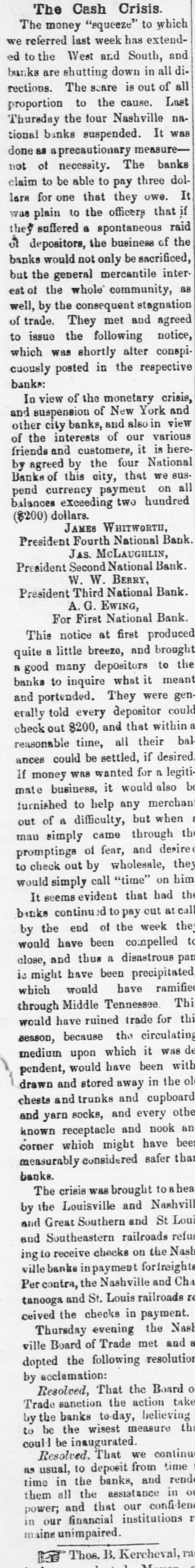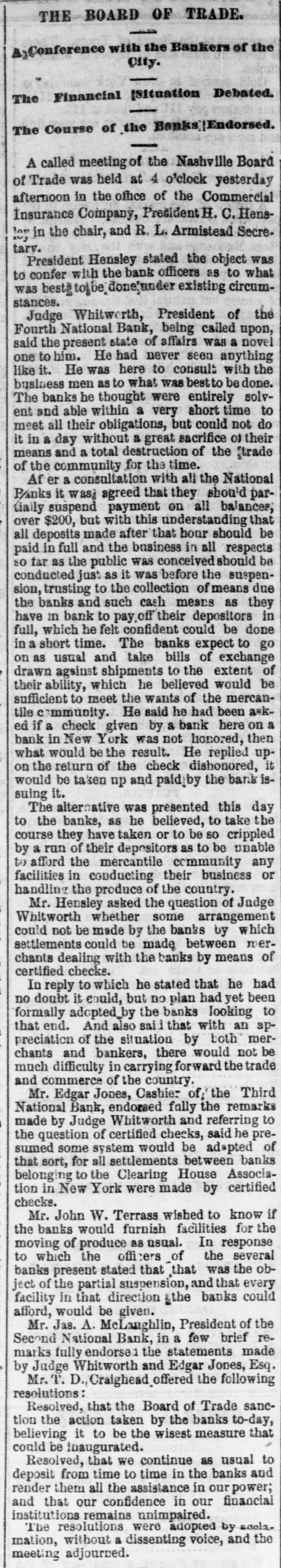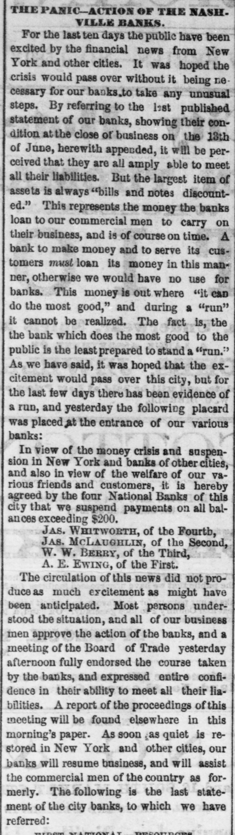 THEPANICACTION OF THE NASHVILLE BANKS. For the last ten days the public have been excited by the financial news from New York and other cities. It was hoped the crisis would pass over without it being necessary for our banks to take any unusual steps. By referring to the lost published statement of our banks, showing their condition at the close of business on the 18th of June, herewith appended, it will be perceived that they are all amply able to meet all their liabilities. But the largest item of assets is always "bills and notes discounted." This represents the money the banks loan to our commercial men to carry on their business, and is of course on time. A bank to make money and to serve its customers must loan its money in this manner, otherwise we would have no use for banks. This money is out where "it can do the most good," and during a "run" it cannot be realized. The fact is, the the bank which does the most good to the public is the least prepared to stand a "run." As we have said, it was hoped that the excitement would pass over this city, but for the last few days there has been evidence of a run, and yesterday the following placard was placed at the entrance of our various banks: In view of the money crisis and suspension in New York and banks of other cities, and also in view of the welfare of our VSrious friends and customers, it is hereby agreed by the four National Banks of this city that we suspend payments on all balances exceeding $200. JAS. WHITWORTH, of the Fourth, JAS. McLAUGHLIN, of the Second, W. W. BERRY, of the Third, A. E.EWING, of the First. The circulation of this news did not produce as much excitement as might have been anticipated. Most persons understood the situation, and all of our business men approve the action of the banks, and a meeting of the Board of Trade yesterday afternoon fully endorsed the course taken by the banks, and expressed entire confidence in their ability to meet all their liabilities. A report of the proceedings of this meeting will be found elsewhere in this morning's paper. As soon as quiet is restored in New York and other cities, our banks will resume business, and will assist the commercial men of the country as formerly. The following is the last statement of the city banks, to which we have referred: