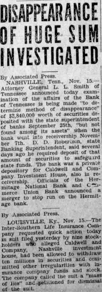 Knoxville, which had funds deposit, was of State heavy withdrawal by forced close doors, the positors State depository of Nashville, failed open the day before. following Tennessee Hermitage Yesterday National Bank of Nashville experiall day, which enced the time. Neither the stood Hermitage had Liberty nor affiliation Caldwell deposits State Holston Bank Knoxville in Caldwell's Bank in Nashville amount total of emperilled by the failures. The Bank, the National, which controlled James father Rogers and chairman board the State Life Insurance Co. St. Louis, saved from possible merger with the American National and the James Caldwell any connection the the pository. combined depository of invested capital The elder Caldwell once trolled the Cumberland Telephone Telegraph that interest and merged the Fourth First National banks, which he headed recent his son's business.