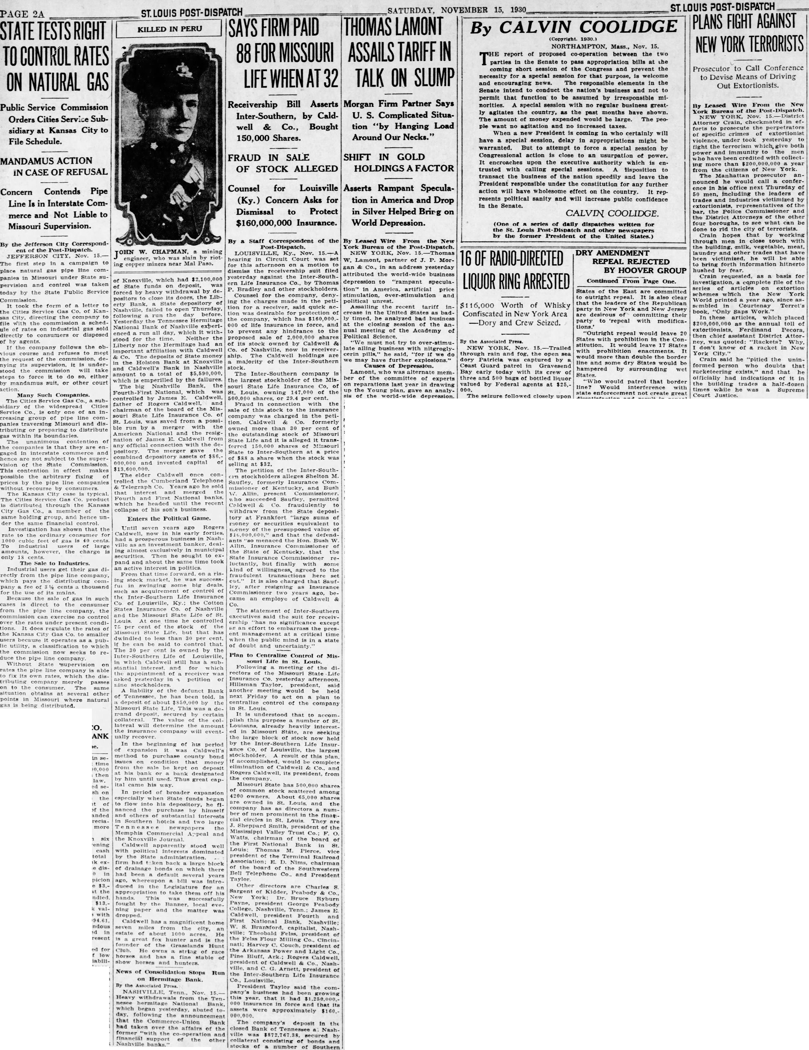 Until years ago Rogers had business Nashinvestment almost in municipal securities. Then he pand and about time took interest in politics. From that stock swinging deals. such acquirement of control the Insurance Co Louisville, Cotton States Insurance Nashville the Missouri State Life St. Louis. At time he controlled per cent of the stock the Missouri State but that has less than 30 per said to that. The 30 per cent owned the of Louisville, Caldwell has and of yesterday petition liability the defunct Bank Tennessee, he been told. deposit about by the Missouri State This mand deposit, secured certain collateral. value the Interal will determine insurance company will eventrecover. In the beginning of his period expansion method purchase county bond issues condition that money from be kept deposit bank bank him until used. Thus great way. In period of broader expansion especially funds began flow into depository, nanced himself and others interests Southern hotels and large the Memphis Commercial Appeal and the Caldwell apparently stood well political interests dominated by State had back large block bonds which there had default several years introduced in Legislature to take them off his hands. was fought by local ning paper and the matter dropped. Caldwell magnificent home seven from the city, estate about 1000 He great fox hunter the founder Grasslands Hunt Club. string of race horses has fine stable of horses and hunters.
