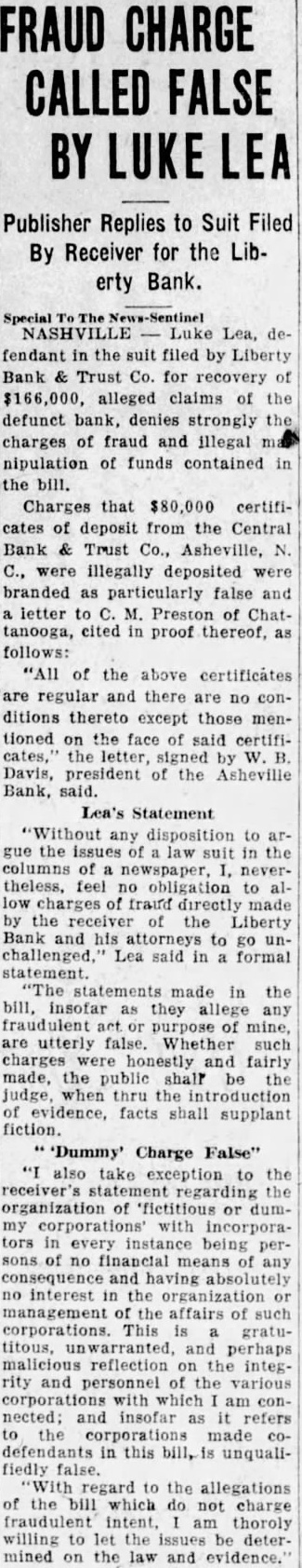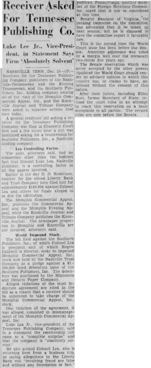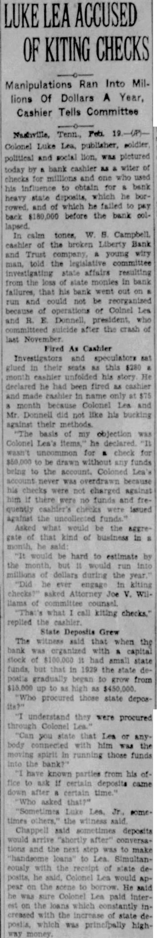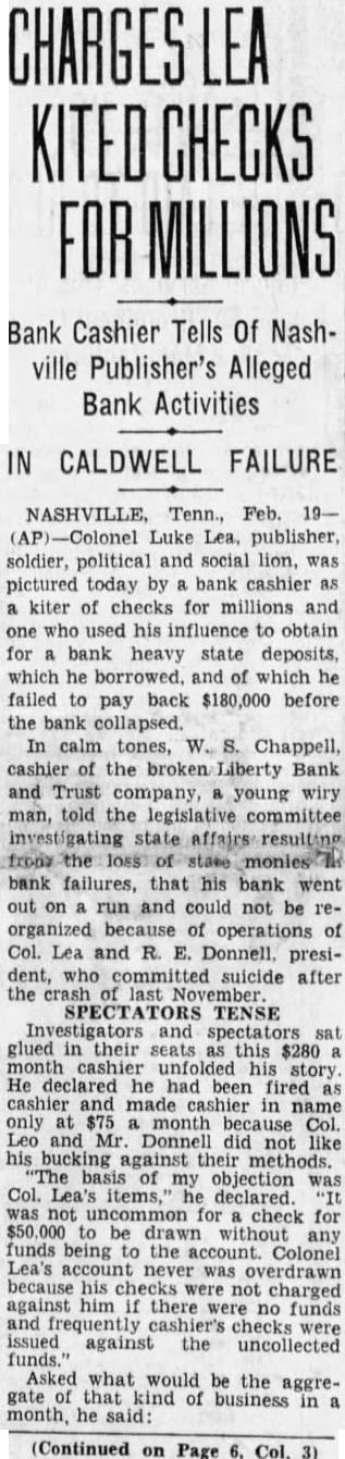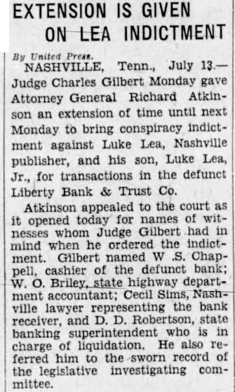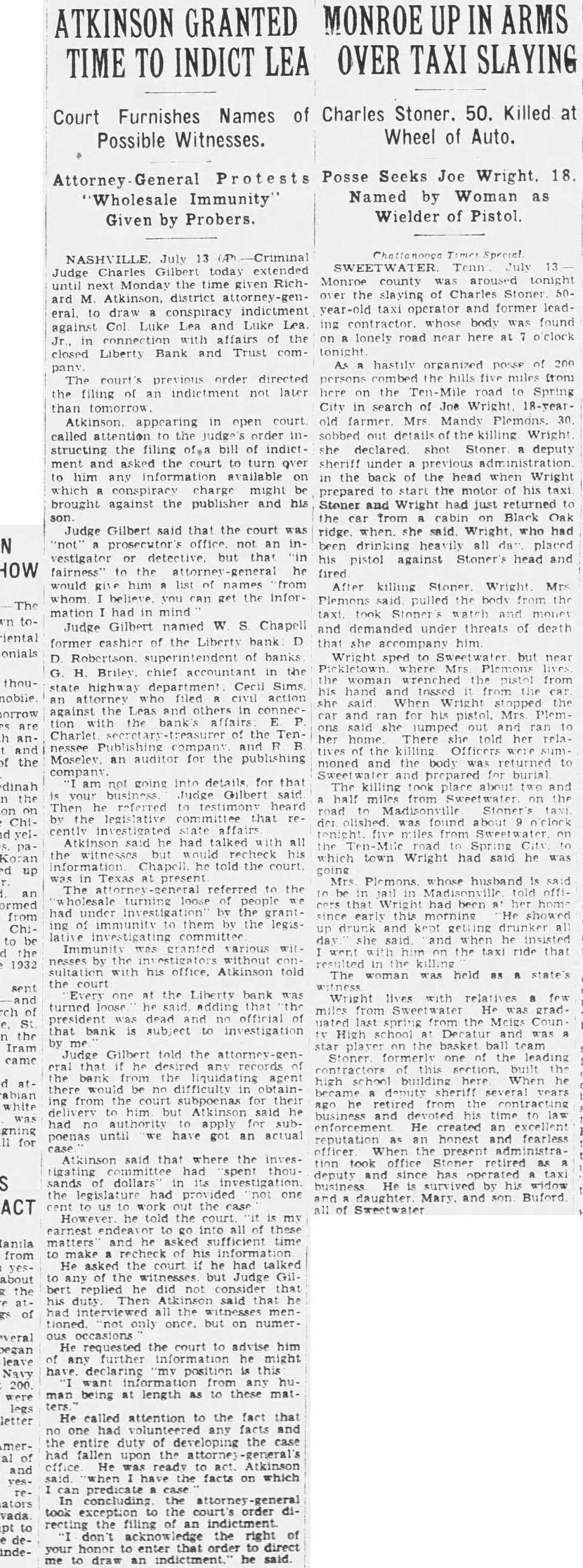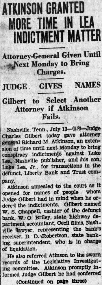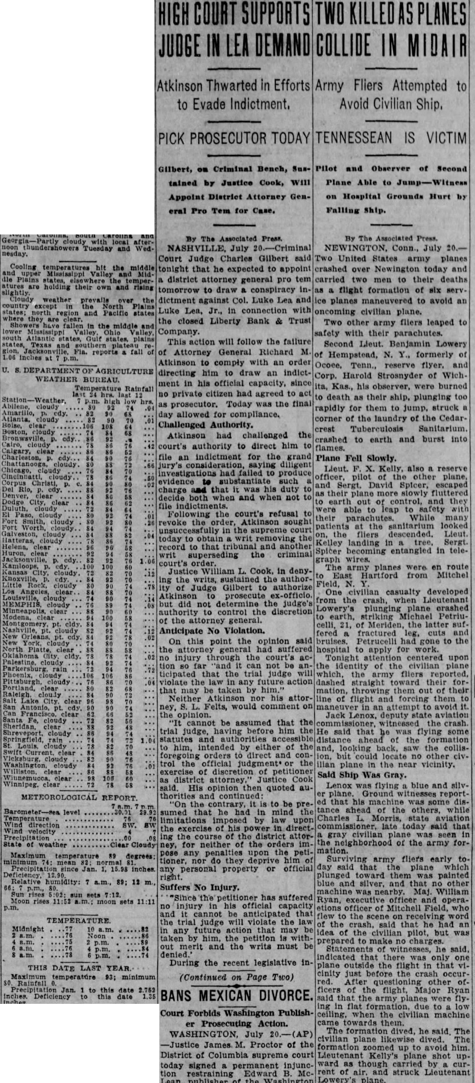 By The Associated Press. By The Associated Press. NASHVILLE, July NEWINGTON, Conn., July Court Judge Charles Gilbert United States army planes Cooling hit the tonight that he expected to appoint crashed over Newington today and district attorney general pro tem carried two men to their deaths their own and rising tomorrow draw conspiracy flight formation of six weather prevails the dictment against Col. Luke Lea planes maneuvered to avoid an Plains Luke Lea, Jr., in with civilian and Pacific states oncoming plane. the closed Liberty Bank & Trust Two other army fliers leaped to the middle Mississippi Ohio Company. safety with their parachutes. This action will follow the failure and Second Lieut. Benjamin Lowery reports of Attorney General Richard M. Hempstead, Y., formerly of Atkinson to comply with an order Ocoee, directing him to draw an indictCorp. Harold Strosnyder of WichWEATHER BUREAU. ment in his official capacity, since Temperature Kas., his observer, were burned Rainfall no private citizen had agreed to act death their ship. plunging too as prosecutor. Today was the final cloudy rapidly for them to jump, struck allowed for compliance, corner of the laundry of the CedarChallenged Authority. crest Tuberculosis Sanitarium. Atkinson challenged the crashed to earth and burst into court's authority to direct him flames. file an indictment for the grand Plane Fell Slowly. Lieut. also reserve of plane, Christi, David Spicer, escaped their fluttered earth out of control, they file indictments. able to safety Following the court's refusal their parachutes. While many revoke Atkinson sought patients the sanitarium in the supreme court descended. Lieut. today obtain writ removing the Kelley landing tree, Sergt. record to that tribunal and another Spicer becoming in telesuperseding the criminal wires. The army planes were en route Justice William L. Cook, in denyEast Hartford from Mitchel the writs, the authorField, Judge Gilbert authorize Angeles, One civilian casualty developed Atkinson prosecute ex-officio. from when Lieutenant did not determine the judge's plunging plane crashed authority control the discretion striking Petriuof the attorney general. celli, 21, of Meriden, the latter sufAnticipate No Violation. fered fractured cuts On this point the opinion said bruises. Petrucelli gone to the general suffered hospital apply for work. injury the court' ac- centered upon far the identity of civilian Parkersburg ticipated the trial judge fliers violate the action dashed straight toward their formay be taken him." mation, throwing them of their Neither Atkinson his attor- line flight and forcing them clear Felts, would comment an attempt to avoid opinion. Jack Lenox, deputy state aviation cannot be assumed that the witnessed crash. judge, before He said that flying and the him, intended by either of the collisorders direct and but could other civ. the official plane the near cloudy exercise of discretion of petitioner Said Ship Was Gray. district attorney.' Justice Cook Winnipeg. Lenox flying blue and silvHis opinion quoted auGround and that his was disthe tance the others, while level sumed that he in mind Charles Morris, state aviation limitations imposed exercise power in direct- late today said of district attor- gray neither of the of the army forfor Maximum any upon temperature degrees: Surviving army fliers early tioner, they mean or official that plane which property plunged toward them was painted humidity: a.m., 89; and silver, and no other Suffers No Injury. Maj. William "Since the petitioner has suffered rises Ryan, officer and sets his official capacity etions officer of Mitchell Field, cannot be anticipated the the trial judge will violate the law the crash, said that he had an Midnight any future action that may of the civilian pilot, but by him, the withprepared make charges. and the writs must Statements witnesses, he was During the recent legislative inplane the in THIS DATE LAST YEAR. cinity just before the temperature 93; minimum (Continued on Page Two) Jan. ficers of the flight, Major Deficiency BANS MEXICAN DIVORCE. that the army in flat when the civilian machine towards The dived, he said, The civilian plane dived. avoid Kelly's shot upward as though carried by of struck Lieutenant plane.
