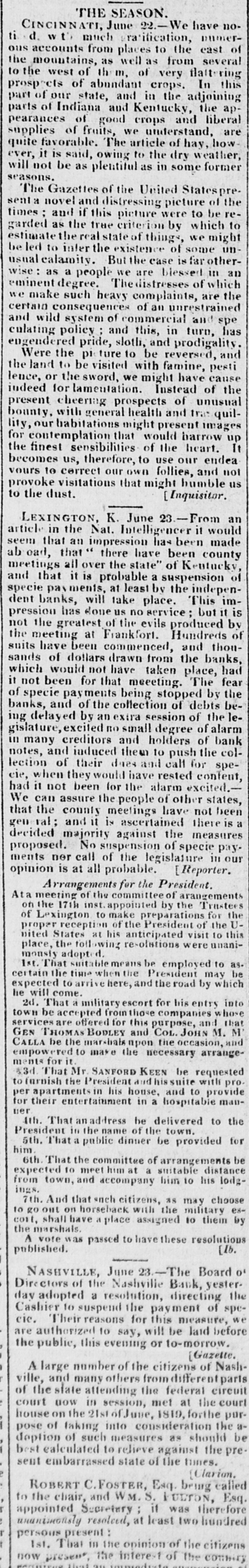 THE SEASON. 22.-We have noCINCINNATI, June ratification, numerti d. accounts with much from places to from the east several of ous mountains, as well as very flattering to of abundant the the west of th m, of In this prospects state, and in the part of our Indiana and parts of good crops pearances of fruits, we of Kentucky, understand, crops. the and hay, adjoining liberal how ap- are quite supplies favorable. said, owing The article to the of dry weather, former ever, will not it is be as plentiful as in some seasons. Gazettes of the United Statespre of the The and distressing picture to be retimes sent a novel and if true this picture criterion were by which might to garded as the the realstate of things, some we unestimate eled to inter the But existence the case of is far other- in an a people we are of such heavy degree. are certain of commercial and wise: and usual eminent we make wild calamity. as consequences system Thedistresses complaints, of an blessed in unrestrained turn, which spe has the engendered culating policy pride, : and sloth, this, be and reversed, prodigality and Were the be pl visited ture to with famine, cause pesti the land to the sword, we might have of the lence, indeed or for lamentation. Instead of unusual present cheering prospects and trat quilhabitations might present lity, bounty. our with general health would barrow images up It contemplation that heart. for sensibilities of the endea the becomes finest us, therefore, to follies, use our and not to the dust. vours provoke 10 visitations correct our that own might [Inquisitor. humble us LEXINGTON, K. June 23.-From it would an the Nat. Intelligencer made article that in an impression has been seem that there have been county ab oad, all over the state" of Kentucky, of meetings that it is probable a suspension indepenand evments, at least by the This will take place. it is has done us no service: specie dent pression banks, produced but im- by greatest, of the evils of not the at Frankfort. Hundreds thouthe commenced, and of dollars drawn from sands would not have taken been for that meeting. the it payments being suits which not meeting have been stopped the place, debts The banks, by had fear and of the collection of the by an extra session of ing excited no small degree of bank creditors and holders banks, of gislature, many specie delayed of the alarm col- be- lein and induced them to push for notes, of their dates and call spelection they would have rested content, cie, not been for the alarm assure the people of had We when it can other excited.- not states, been meetings have is a and it is ascertained general; that the county the measures there decided against No suspension of specie pay. our nor call of the is at all opinion ments proposed. majority probable. legislature President. [Reporter. in Arrangements for the of the committee of arangements Ata meeting 17th inst. appointed by the Trustees for the on the to make preparations the of Lexington reception of the President of to this Uproper States at his anticipated visit unaniuited place, the following re-olations were monsly adopte suitable means be employed to as. be 1st. That time when the President may which expected he certain the to arrive here, and the road by will That come. military escort for his entry whose into 2d. be accepted a frointhose companies and that town offered for this purpose, M. M services are THOMAS BODLEY and COL. JOHN and GEN be the marshals upon the occasion, arrangeempowered CALLA to make the necessary That ments for it Mr. SANFORD KEEN be requested with pro43d. furnish the President and suite provide to apartments in his house, and to manper for their entertainment in a hospitable uer 1th. That an address be delivered to the President in the name of the town. 5th. That a public dinner be provided for him. That the committee of arrangements distance be 6th. to meet him at a suitable his lodgexpected from town, and accompany him 10 ings. And that snch citizens, as may choose es7th. on horseback with the military by the marshals. cort, 10 go out shall have a place assigned to thein published. A vote was passed to have these resolutions [lb. NASHVILLE, June 23.-The Board 0° of the Nashville the a resolution, day Directors adopted Bank, directing yester- of spcCashier to suspend the payment cie. Their reasons for this measure, we are authorized to say, will be laid before the public, this evening or to-morrow. (Gazette. A large number of the citizens of Nash and many others of ville, the state attending the federal circuit court now in session, met at the court house on the 21st of June, 1819, forthe purof taking into consideration the be apose deption of such measures as should best calculated to relieve against the present embarrassed state of the times. (Clarion. ROBERT C. FOSTER, Esq. brung called the chair, and WM. S. FULTON, Esq. to Secretary if was therefore resolved, at least two appointed unanimously hundred persons present the opinion of the citizens