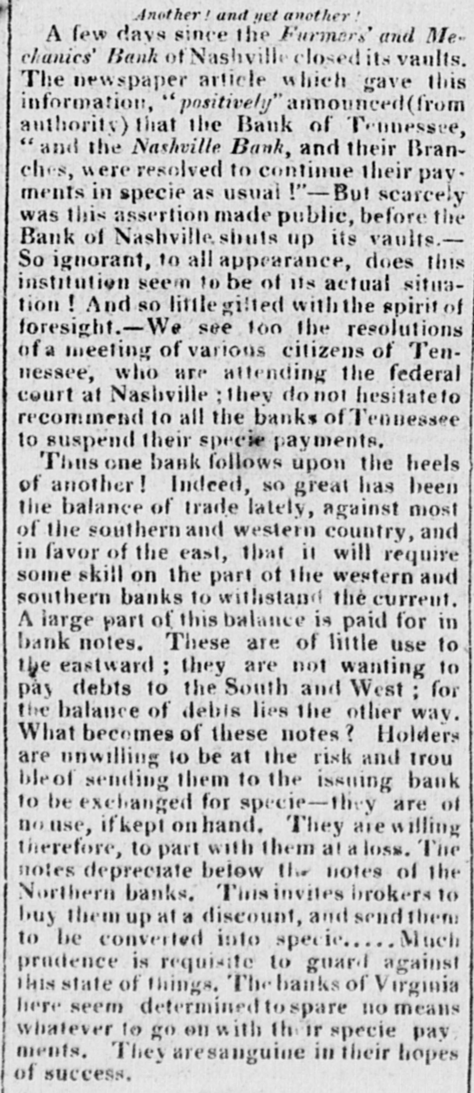 Another! and yet another A few days since the Furmer's' and Me. chanics' Bank of Nashville closed its vaults. The newspaper article which gave this information, "positively" announced (from authority) that the Bank of Tennessee, "and the Nashville Bank, and their Branches, were resolved to continue their pay. ments in specie as usual -But scarcely was this assertion made public, before the Bank of Nashville shuts up its vaults.So ignorant, to all appearance, does this institution seem to be of its actual situation And so little gifted with the spirit of foresight.-We see 100 the resolutions of a meeting of various citizens of Tenmessee, who are attending the federal court at Nashville they do not hesitateto recommend to all the banks of Tennessee to suspend their specie payments. Thus one bank follows upon the heels of another! Indeed, so great has been the balance of trade lately, against most of the southern and western country, and in favor of the east, that it will require some skill on the part of the western and southern banks to withstand the current. A large part of this balance is paid for in bank notes. These are of little use to the eastward; they are not wanting to pay debts to the South and West; for the balance of debis lies the other way. What becomes of these notes? Holders are unwilling to be at the risk and trou ble of sending them to the issuing bank to be exchanged for specie-they are of nouse, ifkept on hand. They are willing therefore, to part with them at a loss. The notes depreciate below the notes of the Northern banks. Thisinvites brokers to buy them up at a discount, and send them Much to be converted into specie predence is requisite to guard against this state of things. The banks of Virginia here seem determined to spare no means whatever to go on with the ir specie pay ments. They aresanguine in their hopes of success.