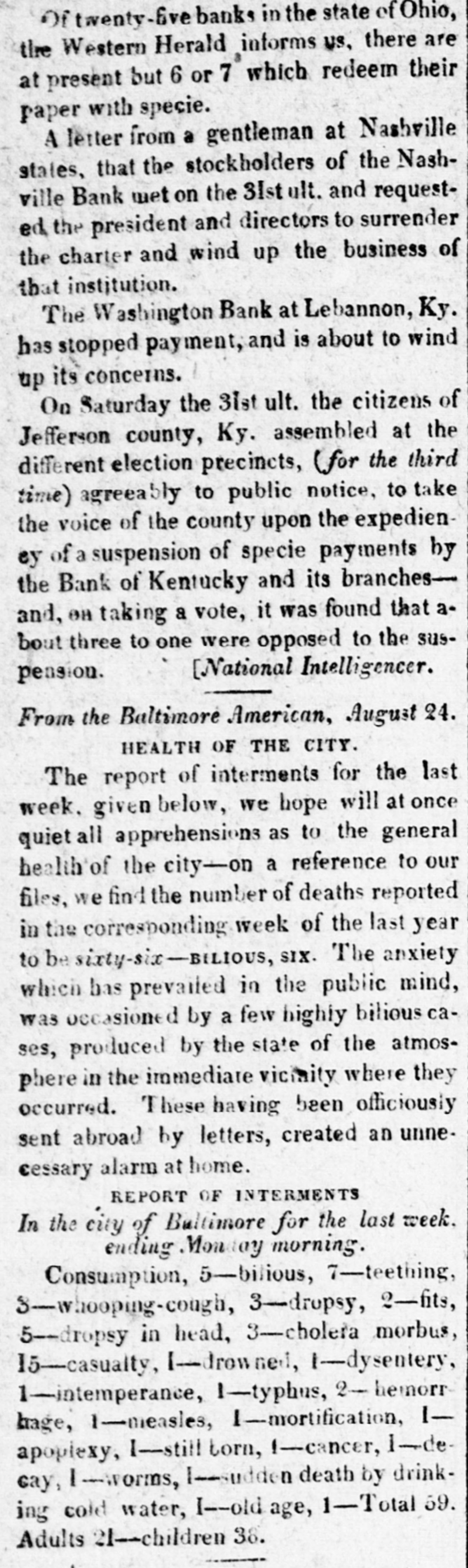 Oftwenty-five banks in the state of Ohio, the Western Herald informs us. there are at present but 6 or 7 which redeem their paper with specie. A letter from a gentleman at Nashville states, that the stockholders of the Nashville Bank met on the 31stult. and requested the president and directors to surrender the charter and wind up the business of that institution. The Washington Bank at Lebannon, Ky. has stopped payment, and is about to wind up its concerns. On Saturday the 31st ult. the citizens of Jefferson county, Ky. assembled at the different election precincts, (for the third time) agreeably to public notice, to take the voice of the county upon the expedieney of a suspension of specie payments by the Bank of Kentucky and its branchesand, on taking a vote, it was found that about three to one were opposed to the sus[National Intelligencer. pension. From the Baltimore American, August 24. HEALTH OF THE CITY. The report of interments for the last week. given below, we hope will at once quiet all apprehensions as to the general health of the city-on a reference to our files, we find the number of deaths reported in the corresponding week of the last year to be sixty-six-BILIOUS, SIX. The anxiety which has prevailed in the public mind, was occasioned by a few highly bilious cases, produced by the state of the atmosphere in the immediate viciality where they occurred. These having been officiously sent abroad by letters, created an unnecessary alarm at home. REPORT OF INTERMENTS In the city of Bultimore for the last week. ending Mon ay morning. Consumption, 5-bilious, 7-teething, 3-whooping-cough, 3-dropsy, 2-fits, 5--dropsy in head, 3-choleta morbus, 15-casualty, I-drowned, I-dysentery, 1-intemperance, 1-typhus, 2- benorr bage, 1-measles, 1--mortification, Iapoplexy, I-still torn, 1-cancer, I-decay, I 1-worms, |--sudden death by drinking cold water, I--old age, 1- Total 59. Adults 21-children 38.