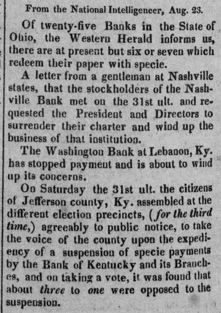 From the National Intelligencer, Aug. 23. Of twenty-five Banks in the State of Ohio, the Western Herald informs us, there are at present but six or seven which redeem their paper with specie. A letter from a gentleman at Nashville states, that the stockholders of the Nashville Bank met on the 31st ult. and requested the President and Directors to surrender their charter and wind up the business of that institution. The Washington Bank at Lebanon, Ky. has stopped payment and is about to wind up its concerns. On Saturday the 31st ult. the citizens of Jefferson county, Ky. assembled at the different election precincts, (for the third time,) agreeably to public notice, to take the voice of the county upon the expediency of a suspension of specie payments by the Bank of Kentucky and its Branches, and on taking a vote, it was found that about three to one were opposed to the suspension.
