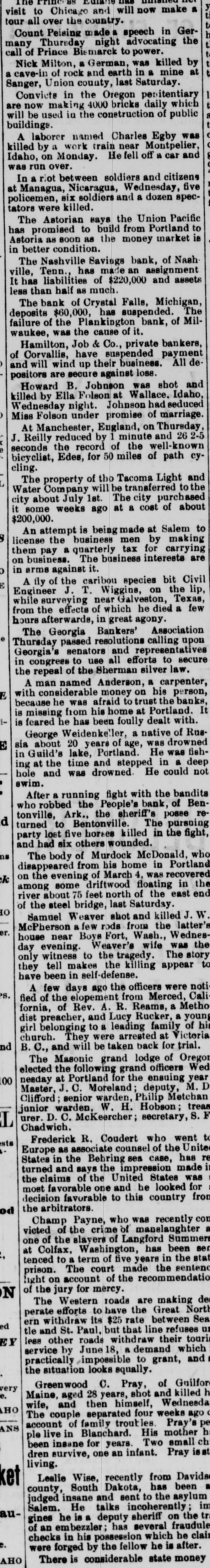 TIME The visit to Chicago and will now make tour all over the country. Count Peising made a speech in Gercall many Thursday night advocating the of Prince Bismarck to power. cave-in Nick Milton, a German, was killed a of rock and earth in a by at Union county, last in the Oregon are Sanger, Convicte now Saturday. penitentiary mine will be making 4000 bricks daily which buildings. used in the conetruction of public killed A laborer named Charles Egby by a work train near was Idaho, on Monday. He fell off Montpelier, a car and was run over. In riot between soldiers and at Managua, Nicaragua, Wednesday, citizens were killed. tators policemen, six soldiers and a dozen spec- five The Astorian says the Union Pacific has Astoria promised to build from Portland to in better as condition. soon as the money market is ville, The Nashville Savings bank, of Nash It has Tenn. liabilities has of made $220,000 an assignment and assets less than half as much. The bank of Crystal Falls, Michigan, failure deposits $60,000, has suspended. waukee, of the Plankington bank, of Mil- The was the cause of it. Hamilton, Job & Co., private bankers, of and Corvallie, will have suspended payment wind up their business. All depositors are secure against loss. Howard B. Johnson was shot killed by Ella Folson Wallace, Idaho, and Wednesday Miss night. Johnson had seduced Folson under promise of J. England, on reduced by minute and seconds At Reilly Manchester, Thursday. marriage. 26 2-5 the record of the cling. bicyclist, Edes, for 50 miles of well-known path cyWater The property of tho Tacoma Light city Company will be transferred and the it about July 1st. The city purchased to $200,000. some weeks ago at a cost of about 8 An attempt is being made at Salem them license the business men by to on pay a quarterly tax for carrying making business. The business interests are in arms against it. A fly of the caribou species bit Engineer J. T. Wiggins, on Civil from while surveying near Galveston, the lip, the effects of which he died Texas, in a Georgia Bankers' Thursday hours The afterwards, great agony. Association few Georgia's passed resolutions calling upon in senators and representatives the congrees to use all efforts to secure repeal of the Sherman silver man named Anderson, a E because money on his with A considerable he was carpenter, law. person, is afraid he has been is missing from his home banks, It George feared foully to trust dealt Portland. the with Weidenke'ler, a native of E sia in about 20 years of age, Rus Guild's lake, Portland. was He drowned hole ing at the time and stepped in was a fishswim. and was drowned He could deep not After a running fight with the bandits tonville, who robbed the People's bank, of d fight, turned party to Ark.. Bentonville. the sheriff's The posse pursuing Ben reand lost five horses killed in the had six others wounded. ns The body of Murdock McDonald, on from his home in ck evening of March 4, was among disappeared the recovered Portland who river some driftwood floating of about 75 feet north of the in end the steel bridge, last 10 Weaver shot and killed McPherson Samuel the Saturday. east er. a few rods from the J.W near Boys Fort, Wash., only day house evening Weaver's wife Wednes- latter's they witness tell to the tragedy. The was the have makes the killing appear story to been in self-defense. P.S. fied A few days ago the officers were fornia, of the elopement from Merced, noti dist of Rev. A. R. Reams, a Cali girl preacher, and Lucy Rucker, Metho to a leading a young nd B. They were arrested at of hi church. C., belonging family Victoria The and will be taken back for trial, Masonic grand lodge of elected the following grand officers Oregon 100 needay Master, at Portland for the ensuing Wed Clifford J.C. Moreland deputy, year junior senior warden. Philip Metchan M. urer. D. warden, W. H. Hobson L Chadwich, C. McKeercher; secretary, treas S.F ests Europe Frederick R. Coudert who as associate counsel of went States turned in and the Behring sea Case, the has United the claims says the impression made most of the United States favorable one and be looked was arbitrators. od the decision favorable to this country for from Champ Payne, who was recently con one victed of the of the crime of manelaughter Colfax, slayers of Langford Summer to a term of five years in ser at tenced prison. Washington, has been the light on The court made the N of the jury account for mercy. of the recommendation sentend The Western roads are making de ern to have the ed perate efforts withdraw its $25 Great North tle and St. Paul, but that rate line between Sea EY service less other roads withdraw their refuses un by June 18, a demand touri practically the impossible to grant, which and situation looks squally. very Greenwood c. Pray, wife, Maine, aged 28 years, shot and of Guilfor HO and then himself, killed account of four weeks ago ANS The le live couple family separated troubles Wednesda Pray's pe been in Blanchard. His mother H dren insane for years. Two small ch living. survive, one an infant. Pray is st ket Lealie Wise, recently from county, judged South Dakota, has Davida Salem. insane and sent to the asylum been au gines He talks incoherently of an he a deputy sheriff im checks embezzler ; has several on fraudule the t e. were in his possession which he clair forged by the fellow he is after. AHO There is considerable state money