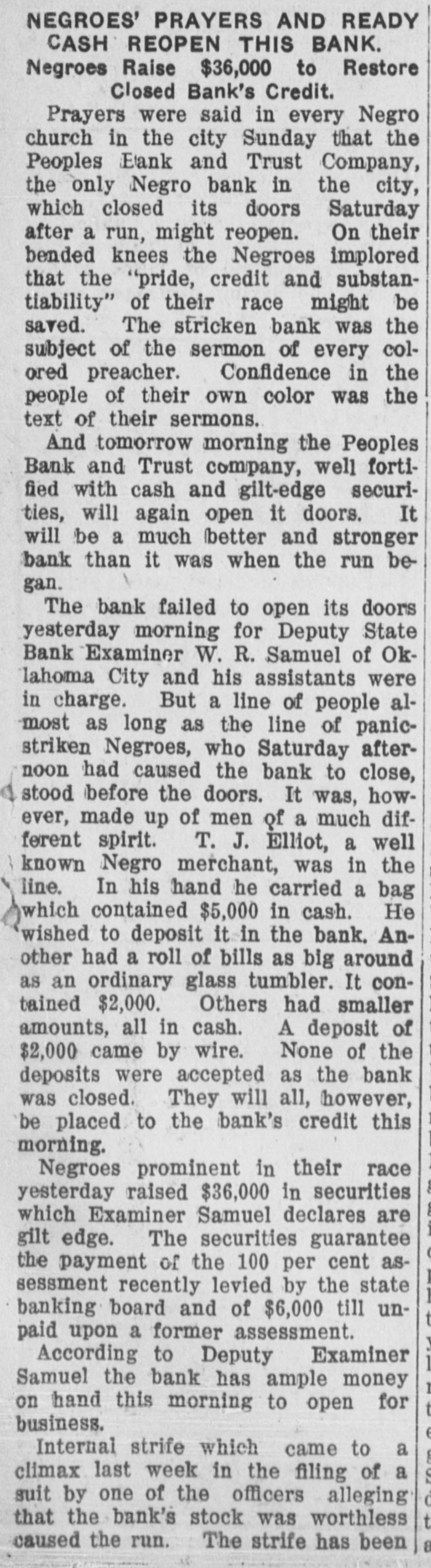 NEGROES' PRAYERS AND READY CASH REOPEN THIS BANK. Negroes Raise $36,000 to Restore Closed Bank's Credit. Prayers were said in every Negro church in the city Sunday that the Peoples Bank and Trust Company, the only Negro bank in the city, which closed its doors Saturday after a run, might reopen. On their bended knees the Negroes implored that the "pride, credit and substantiability" of their race might be saved. The stricken bank was the subject of the sermon of every colored preacher. Confidence in the people of their own color was the text of their sermons. And tomorrow morning the Peoples Bank and Trust company, well fortified with cash and gilt-edge securities, will again open it doors. It will be a much better and stronger bank than it was when the run began. The bank failed to open its doors yesterday morning for Deputy State Bank Examiner W. R. Samuel of Oklahoma City and his assistants were in charge. But a line of people almost as long as the line of panicstriken Negroes, who Saturday afternoon had caused the bank to close, stood before the doors. It was, however, made up of men of a much different spirit. T. J. Elliot, a well known Negro merchant, was in the line. In his hand he carried a bag which contained $5,000 in cash. He wished to deposit it in the bank. Another had a roll of bills as big around as an ordinary glass tumbler. It contained $2,000. Others had smaller amounts, all in cash. A deposit of $2,000 came by wire. None of the deposits were accepted as the bank was closed. They will all, however, be placed to the bank's credit this morning. Negroes prominent in their race yesterday raised $36,000 in securities which Examiner Samuel declares are gilt edge. The securities guarantee ( the payment of the 100 per cent assessment recently levied by the state banking board and of $6,000 till unt paid upon a former assessment. According to Deputy Examiner } Samuel the bank has ample money 1 on hand this morning to open for t business. e Internal strife which came to a E climax last week in the filing of a s suit by one of the officers alleging 0 that the bank's stock was worthless t caused the run. The strife has been