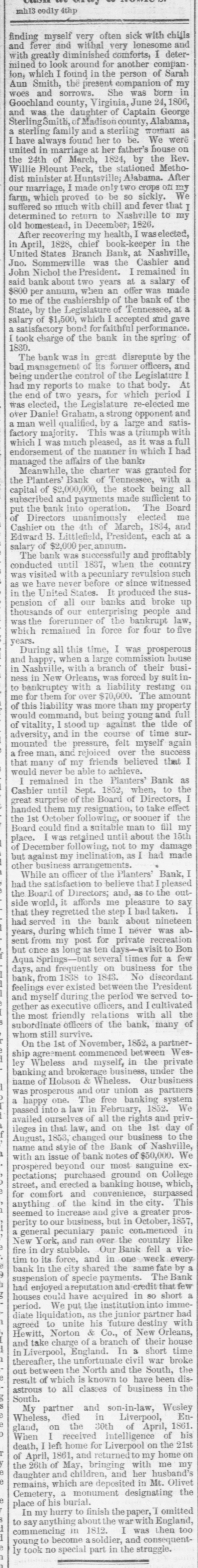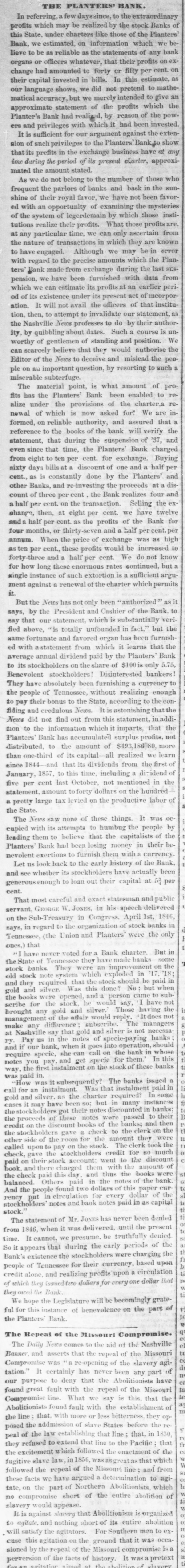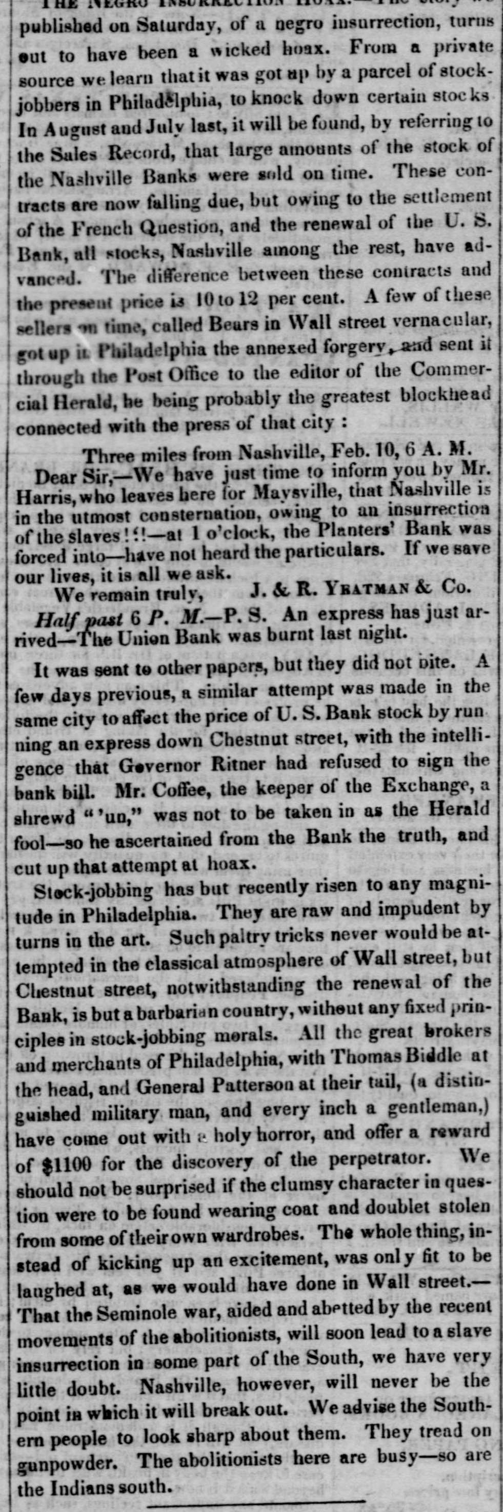 published on Saturday, of a negro insurrection, turns out to have been a wicked boax. From a private source we learn that it was got up by a parcel of stockjobbers in Philadelphia, to knock down certain stocl ks In August and July last, it will be found, by referring to the Sales Record, that large amounts of the stock of the Nashville Banks were sold on time. These contracts are now falling due, but owing to the settlement of the French Question, and the renewal of the U. S. Bank, all stocks, Nashville among the rest, have advanced. The difference between these contracts and the present price is 10 to 12 per cent. A few of these sellers on time, called Beurs in Wall street vernacular, got up it Philadelphia the annexed forgery, and sent it through the Post Office to the editor of the Commercial Herald, he being probably the greatest blockhead connected with the press of that city : Three miles from Nashville, Feb. 10, 6 A. M. Dear Sir,-We have just time to inform you by Mr. Harris, who leaves here for Maysville, that Nashville is in the utmost consternation, owing to an insurrection of the slaves!!!-a 1 o'clock, the Planters' Bank was forced into-have not heard the particulars. If we save our lives, it is all we ask. J. & R. YEATMAN & Co. We remain truly, Half past 6 P. M.-P.S. An express has just arrived-The Union Bank was burnt last night. It was sent to other papers, but they did not bite. A few days previous, a similar attempt was made in the same city to affect the price of U.S. Bank stock by run ning an express down Chestnut street, with the intelligence that Governor Ritner had refused to sign the bank bill. Mr. Coffee, the keeper of the Exchange, a shrewd "'un," was not to be taken in as the Herald fool-so he ascertained from the Bank the truth, and cut up that attempt at hoax. Stock-jobbing has but recently risen to any magnitude in Philadelphia. They are raw and impudent by turns in the art. Such paltry tricks never would be attempted in the classical atmosphere of Wall street, but Chestnut street, notwithstanding the renewal of the Bank, is but a barbarian country, without any fixed principles in stock-jobbing morals. All the great brokers and merchants of Philadelphia, with Thomas Biddle at the head, and General Patterson at their tail, (a distinguished military man, and every inch a gentleman,) have come out with a holy horror, and offer a reward of $1100 for the discovery of the perpetrator. We should not be surprised if the clumsy character in question were to be found wearing coat and doublet stolen from some of their own wardrobes. The whole thing, instead of kicking up an excitement, was only fit to be laughed at, as we would have done in Wall street.That the Seminole war, aided and abetted by the recent movements of the abolitionists, will soon lead to a slave insurrection in some part of the South, we have very little doubt. Nashville, however, will never be the point in which it will break out. We advise the Southern people to look sharp about them. They tread on gunpowder. The abolitionists here are busy-so are the Indians south.