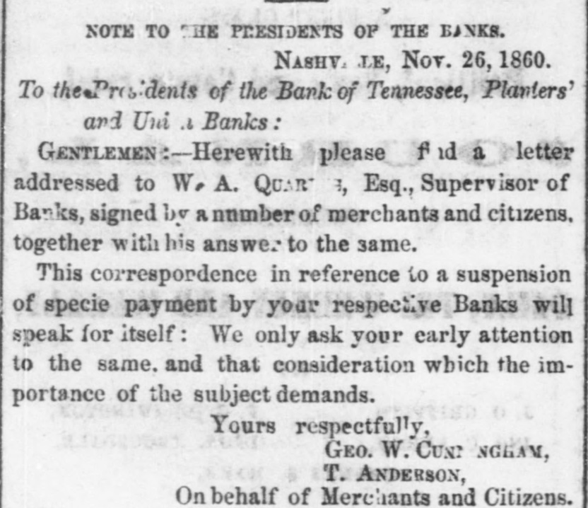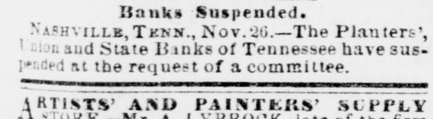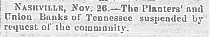 TELEGRAPHED TO THE NEW ORLEANS CRESCENT. LATER FROM CALIFORNIA. ARRIVAL OF THE PONY EXPRESS. [BY THE SOUTHWESTERN LINE.] FORT KEARNEY, Nov. 25.-The Central Overland Pony Express passed here to-day, with California dates to the 14th inst. SAN FRANCISCO, Nov. 14.-The trade with the country, since the departure of the last express, has been less active. We quote Rio Coffee at 142 to 15c. per lb. Sugar is quiet, and sales are made at previous rates. The Presidential election returns, from the distant counties in the State of California, were coming in slowly. That Lincoln has carried the State there can be no donbt. Valuable mineral discoveries have been made near the Esmeralda mines and in Sonora. Esporsa, the filibuster ringleader, was killed in a fight in Lower California. His band of marauders are committing robberies and murder by the wholesale. European Letters and Circulars. NEW YORK, Nov. 26.-The steamship Arago, from Southampton the 14th inst., arrived at this port at 2 o'clock yesterday afternoon. The mails brought by her for the Sonthern cities were sent off in the early evening train. Messrs. James Hewitt & Co. confirm their report by the Palestine, and say that the cotton market closed firm. Spinners purchase sparingly. They quote Middling Orleans at 91d. They put down the imports of the week ending with Friday, the 9th inst., at 10,000 bales. The total quantity of cotton known to be at sea on Saturday was 60,000 bales, against 90,000 at the corresponding period last year. Messrs. James Hewitt & Co. report the Manchester trade unchanged. The same circular reports Lard active and advanced 6d. to 12d. Havre Cotton Market. HAVRE, Nov. 9.-The prices of cotton yesterday fully recovered the decline of 1 to 2f. We quote New Orleans Bas at 94f. The sales to-day were confined to 1500 bales, the market closing quiet at unchanged quotations. Bank Suspensions in Tennessee. NASHVILLE, Nov. 26.-At the urgent request of the community, the Bank of Tennessee and the Planters' and Union Banks suspended specie payment to -day. Failure in Buffalo. BUFFALO, Nov. 24.-The money panic here is felt with severity. The extensive banking establishment of Messrs. Wm. o. Brown & Co. suspended to-day. New Orleans Mails for Europe. NEW YORK, Nov. 24.-The steamship Bremen sailed from this port to-day for Southampton and Bremen, taking out New Orleans mails of the 19th inst., and telegraphic dispatches from New Orleans of the 23d. The Crisis Rapidly Abating. NEW YORK, Nov. 24.-The most cheerful feelings continue to prevail here. The associated banks have discounted seven millions of dollars since Wednesday. Specie remains undistributed. Stocks have advanced ten per cent. since Tuesday. The best paper is discounted at ten per cent. Rates have still a downward tendency. Action of the Boston Banks. BOSTON, Nov. 24.-A meeting of the Boston banks was held to-day and resolved to expand the discounts as the only means of saving the merchants. The measures practically came from New York. Mississippi Legislative Proceedings. JACKSON, Nov. 26.-The extra session of the Legislature of Mississippi merely organized to-day. The Governor's message to the Legislature was read in both Houses. Its tone is uncompromising. The members all appear to be unanimous for secession. [There is no possibility of obtaining a full report to -night on account of an interruption in the working of the telegraph line.] River Intelligence. VICKSBURG, Nov. 26.-The steamer McDowell passed down at 3 o'clock on Sunday, the Scotland passed down at noon, the Sioux City at 4, the L. M. Kennett at 5, and the James Battle at 10 o'clock P. M. yesterday.