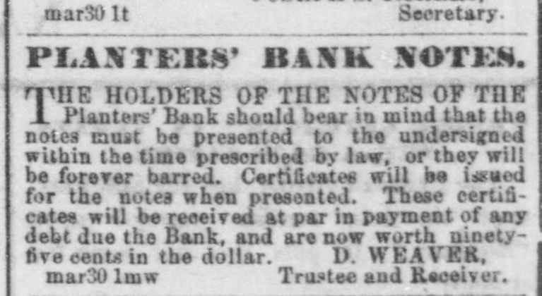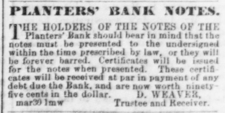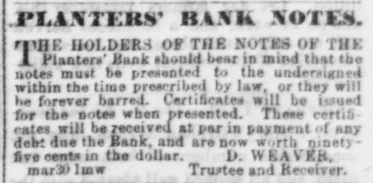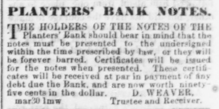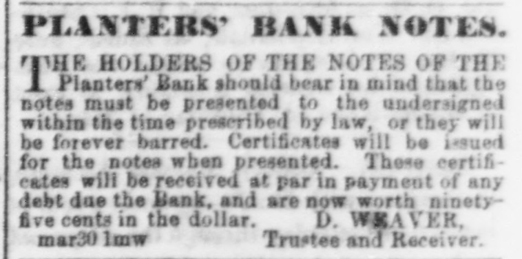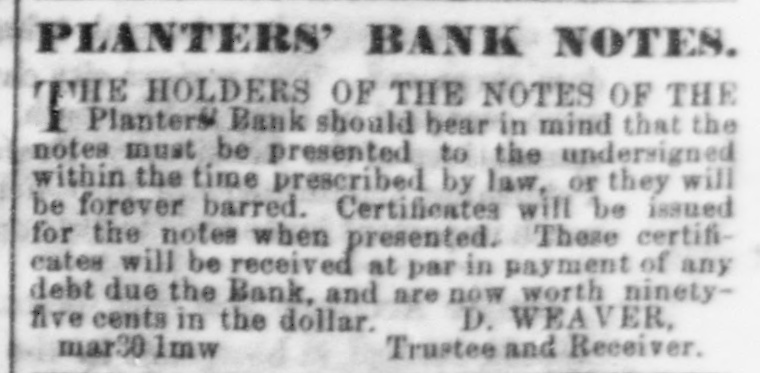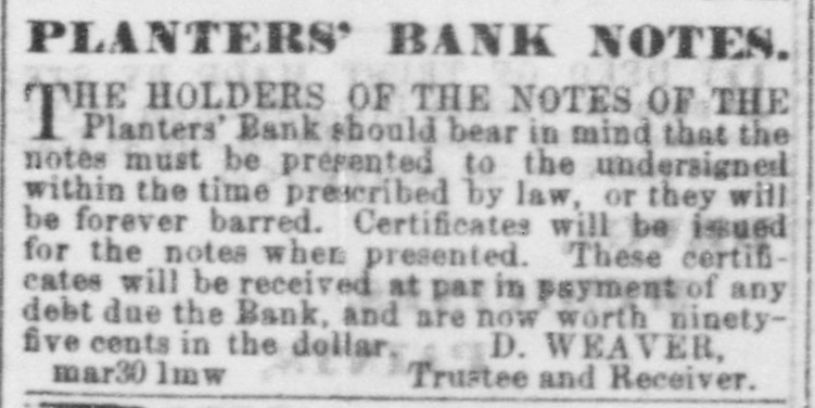 Planters' Bank should bear in mind that the notes must be presented to the undersigned within the time prescribed by law, or they will be forever barred. Certificates will be issued for the notes when presented. These certificates will be received at par in payment of any debt due the Bank, and are now worth ninety-five cents in the dollar. D. WEAVER,