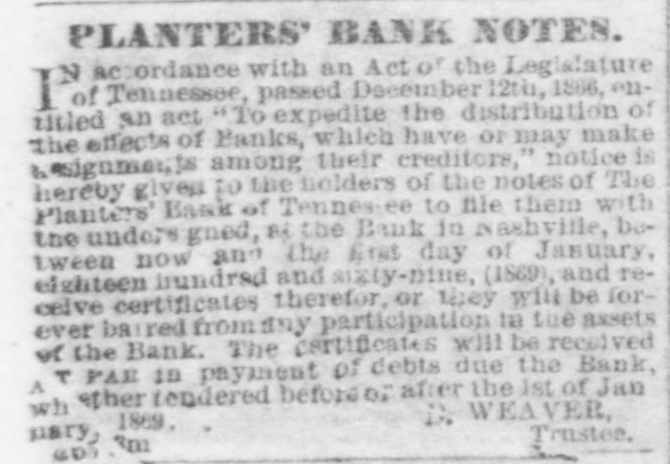IN accordance with an Act of the Legislature of Tennessee, passed December 12th, 1866, entitled an act "To expedite the distribution of the effects of Banks, which have or may make assignments among their creditors," notice is hereby given to the holders of the notes of The Planters' Bank of Tennessee to file them with the under's gned, at the Bank in Nashville, between now and the first day of January, eighteen hundred and sixty-nine, (1869), and receive certificates therefor, or they will be forever barred from any participation in the assets of the Bank. The certificates will be received