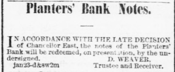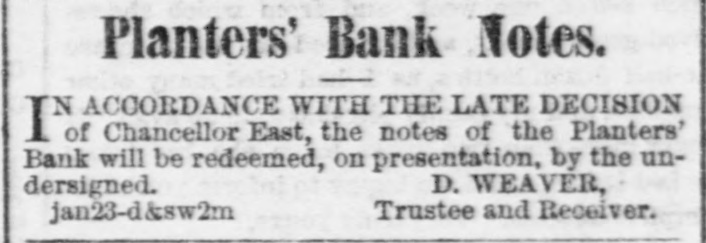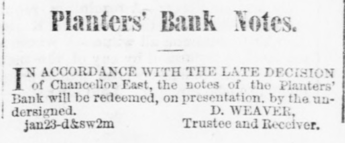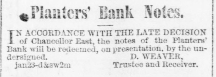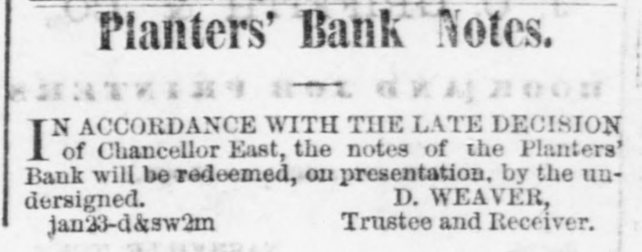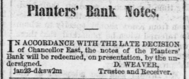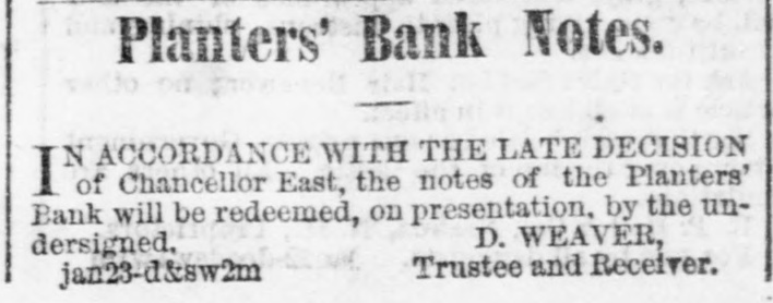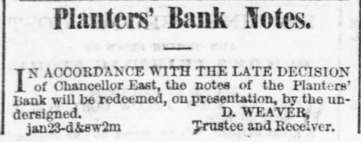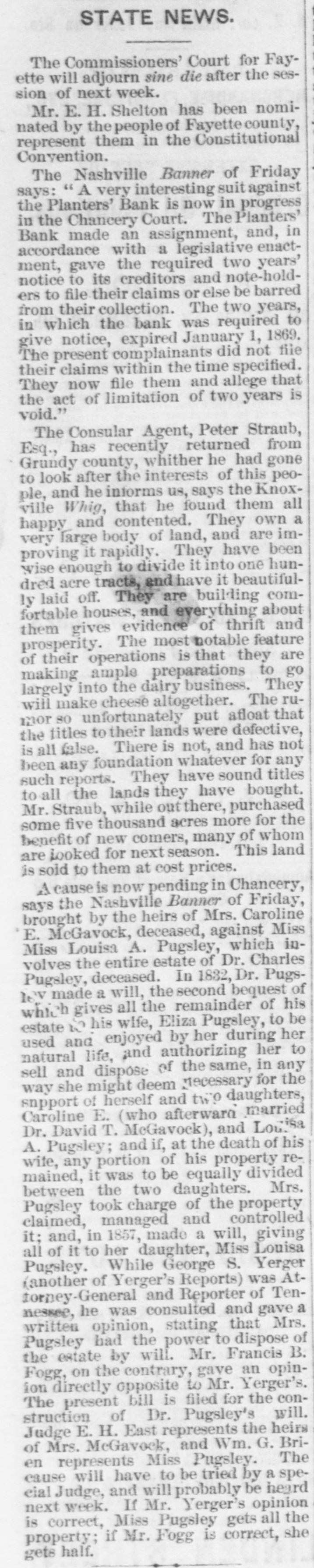 STATE NEWS. The Commissioners' Court for Fayette will adjourn sine die after the session of next week. Mr. E. H. Shelton has been nominated by the people of Fayette county, represent them in the Constitutional Convention. The Nashville Banner of Friday says: " A very interesting suit against Planters' Bank is now in progress in Court. an assignment, with a the accordance Bank the Chancery made legislative The two Planters' and, years' enact- in ment, gave the required notice to its creditors and note-holders to file their claims or else be barred from their collection. The two years, in which the bank was required to give notice, expired January 1, 1869. The present complainants did not file their claims within the time specified. They now file them and allege that the act of limitation of two years is void." The Consular Agent, Peter Straub, Esq., has recently returned from Grundy county, whither he had gone to look after the interests of this people, and he informs us, says the Knoxville Whig, that he found them all and contented. a body of land, are happy very They own it rapidly. to divide it one and have dred proving wise enough large acre tracts, They into and it have beautiful- hun- been imoff. They are ly laid building about comfortable houses, and everything them gives evidence of thrift and prosperity. The most notable feature of their operations is that they are making ample preparations to go largely into the dairy business. They will make cheese altogether. The rumorso unfortunately put afloat that the titles to their lands were defective, is all false. There is not, and has not been any foundation whatever for any such reports. They have sound titles all the lands they have bought. Ir.Straub, while out there, purchased some five thousand acres more for the benefit of new comers, many of whom for next season. land to them at cost is now pending Nashville Banner says the Acause sold Looked prices. Mrs. in of Chancery, This Caroline Friday, brought by the heirs of E. McGavock, deceased, against Miss Miss Louisa A. Pugsley, which inthe entire estate of Dr. Charles deceased. In made a will, the second all the remainder which volves Pugsley, gives 1832, Pugsley, bequest Dr. of Pugs- to his be of estate in his wife, Eliza her enjoyed by her during and sell of the same, any she deem necessary used natural way and and life, might dispose authorizing daughters, for her in the to snpport of herself and tw: married Caroline E. (who afterward isa Dr. David T. McGavock), and Lou Pugsley; and if, at the death of his wife, any portion of his property remained, it was to be equally divided between the two daughters. Mrs. Pugsley took charge of the property claimed, managed and controlled it: and, in 1857, made a will, giving all of it to her daughter, Miss Louisa Pugsley. While George S. Yerger (another of Yerger's Reports) was Atand Reporter of Tenhe was consulted a stating had the power to torney-General nessee, Pugsley written opinion, and that dispose gave Mrs. of estate by will. Mr. on the contrary, gave an opposite to The bill is the ion Fogg, directly present filed Mr. for Francis Yerger's. the opin- will. con- B. struction of Dr. Pugsley's Judge E. H. East represents the heirs of Mrs. McGavock, and Wm. G. The Brien represents Miss Pugsley. cause will have to be tried by a speeial Judge, and will probably be heard next week. If Mr. Yerger's opinion is correct, Miss Pugsley gets all the property; if Mr. Fogg is correct, she gets half.