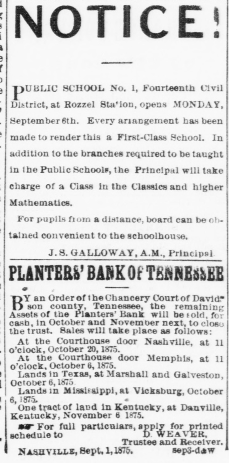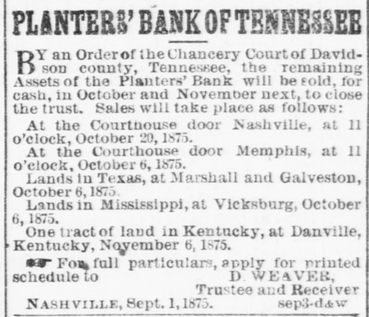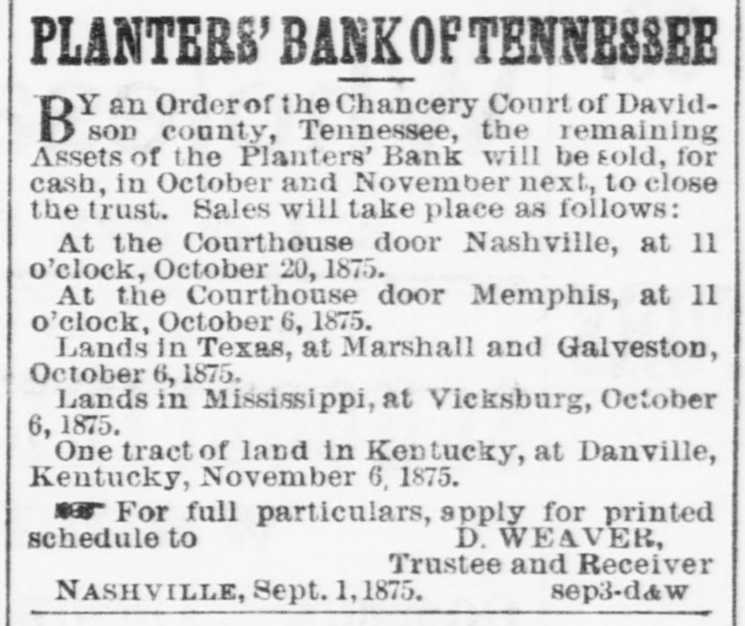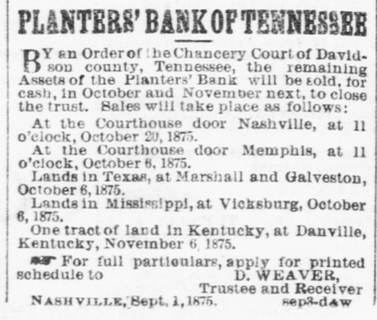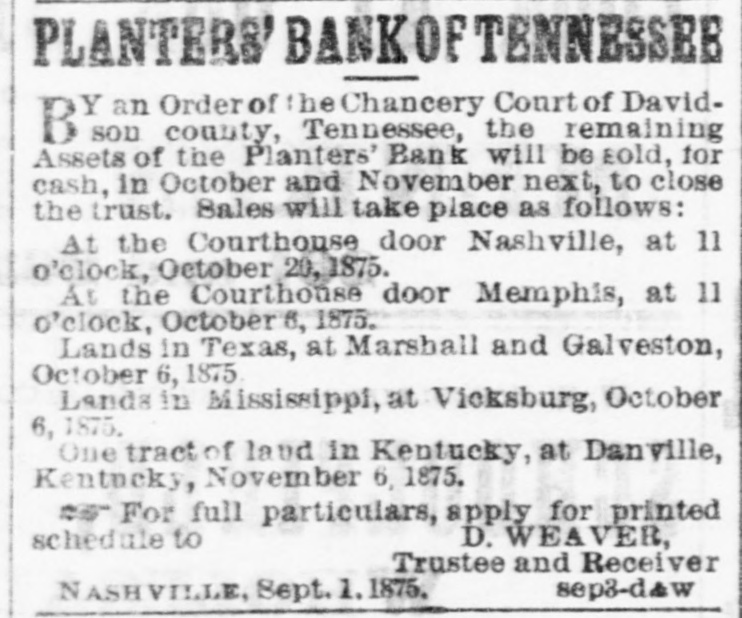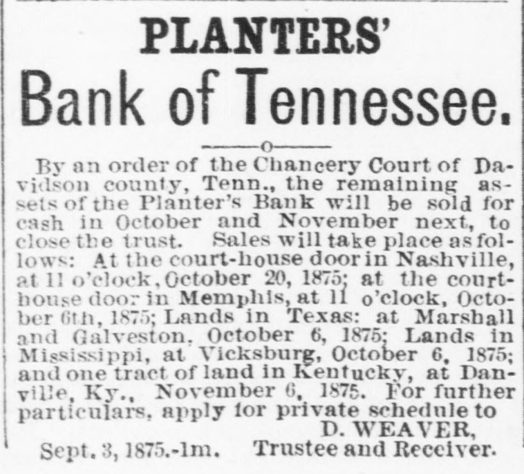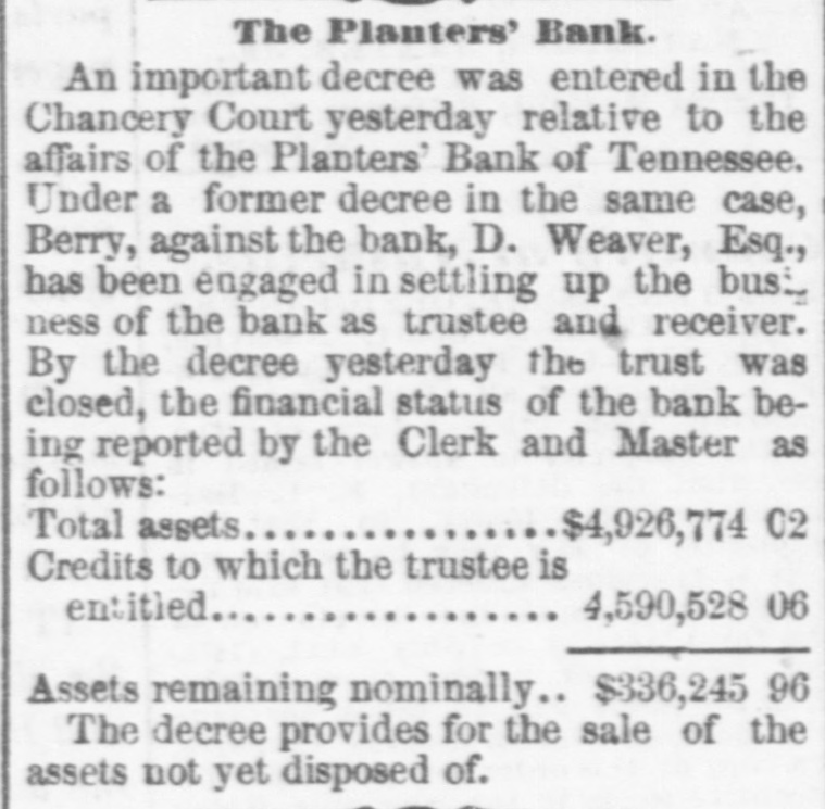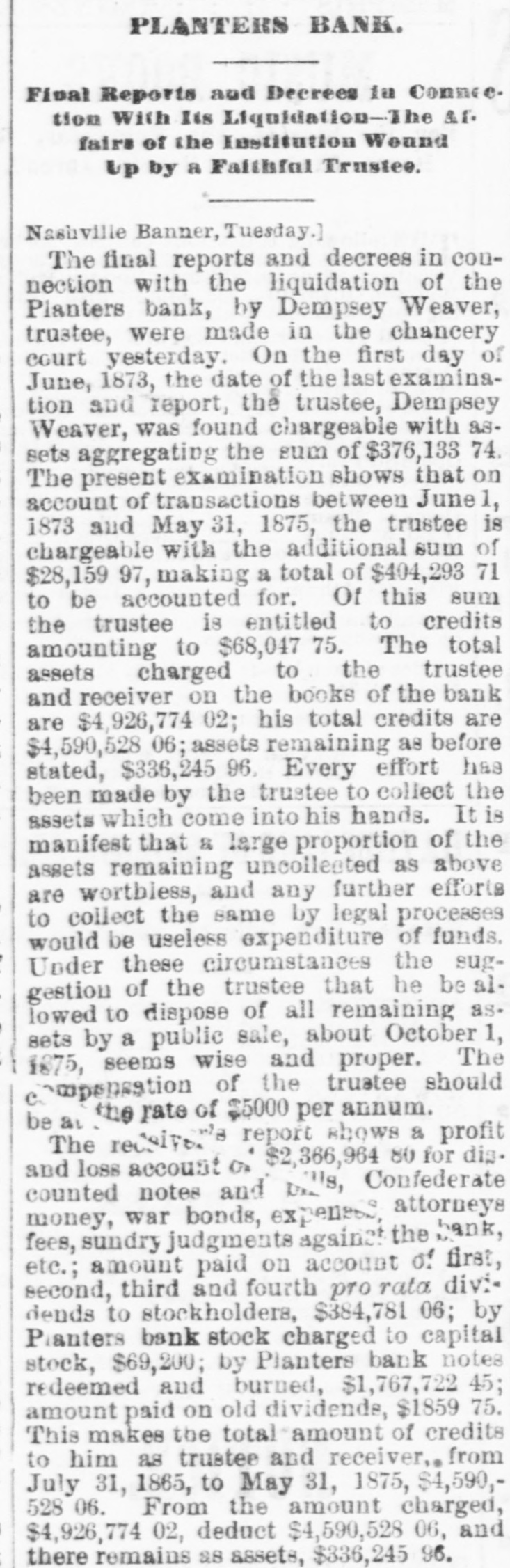 PLANTERS BANK. Fival Reports and Decrees in Counce. tion With Its Liquidation-The & 1. fairs of the Institution Wound Up by a Faithful Trustee. Nashville Banner, Tuesday.] The final reports and decrees in connection with the liquidation of the Planters bank, by Dempsey Weaver, trustee, were made in the chancery court yesterday. On the first day of June, 1873, the date of the last examinstion and report, the trustee, Dempsey Weaver, was found chargeable with assets aggregating the sum of $376,133 74. The present examination shows that on account of transactions between June 1, 1873 and May 31, 1875, the trustee is chargeable with the additional sum of $28,159 97, making a total of $404,293 71 to be accounted for. Of this sum the trustee is entitled to credits amounting to $68,047 75. The total assets charged to the trustee and receiver on the books of the bank are $4,926,774 02; his total credits are $4,590,528 06; assets remaining as before stated, $336,245 96 Every effort has been made by the trustee to collect the assets which come into his hands. It is manifest that & large proportion of the assets remaining uncollected as above are wortbless, and any further efforts to collect the same by legal processes would be useless expenditure of funds. Under these circumstances the suggestion of the trustee that he be allowed to dispose of all remaining assets by a public sale, about October 1, seems proper. C. 1875, companiation wise of the and trustee should The be as the rate of $5000 per annum. The receive." 8 report shows a profit and loss account O $2,366,964 80 for dis. counted notes and Confederate money, war bonds, expenses, attorneys fees, sundry judgments against the bank, etc.; amount paid on account of first, second, third and fourth pro rata dividends to stockholders, $384,781 06; by Planters bank stock charged to capital stock, $69,200; by Planters bank notes redeemed and burned, $1,767,722 45; amount paid on old dividende, $1859 75. This makes the total amount of credits to him as trustee and receiver, from July 31, 1865, to May 31, 1875, $4,590,528 06. From the amount charged, $4,926,774 02, deduct $4,590,528 06, and there remains as assets, $336,245 96.