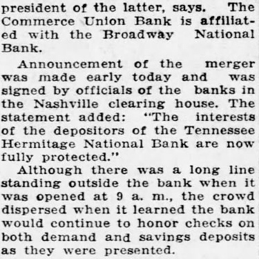 president of the says. The Commerce Union Bank is affiliated with the Broadway National Bank. Announcement of the merger made early today and was signed by officials of the banks the Nashville clearing house. The added: "The interests of the depositors of the Tennessee National Bank are now fully protected. Although there was a long line standing outside the bank when opened at the crowd dispersed when it learned the bank would continue to honor checks both demand and savings deposits they