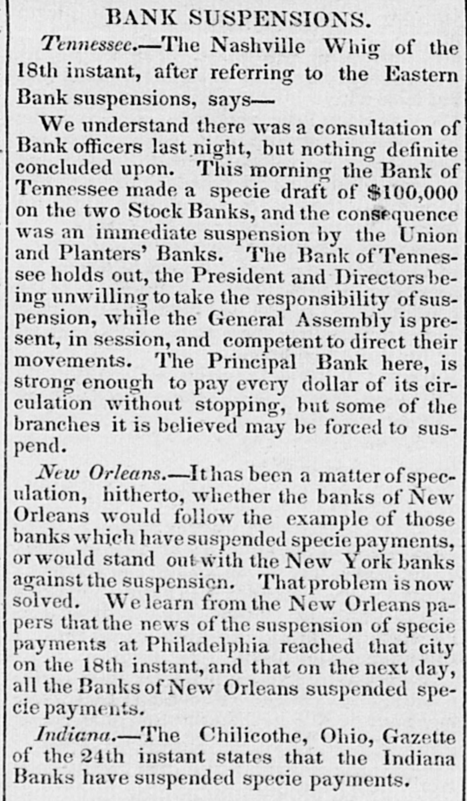 # BANK SUSPENSIONS. Tennessee. The Nashville Whig of the 18th instant, after referring to the Eastern Bank suspensions, says- We understand there was a consultation of Bank officers last night, but nothing definite concluded upon. This morning the Bank of Tennessee made a specie draft of $100,000 on the two Stock Banks, and the consequence was an immediate suspension by the Union and Planters' Banks. The Bank of Tennessee holds out, the President and Directors being unwilling to take the responsibility of suspension, while the General Assembly is present, in session, and competent to direct their movements. The Principal Bank here, is strong enough to pay every dollar of its circulation without stopping, but some of the branches it is believed may be forced to suspend. New Orleans. It has been a matter of speculation, hitherto, whether the banks of New Orleans would follow the example of those banks which have suspended specie payments, or would stand out with the New York banks against the suspension. That problem is now solved. We learn from the New Orleans papers that the news of the suspension of specie payments at Philadelphia reached that city on the 18th instant, and that on the next day, all the Banks of New Orleans suspended specie payments. Indiana. The Chilicothe, Ohio, Gazette of the 24th instant states that the Indiana Banks have suspended specie payments.