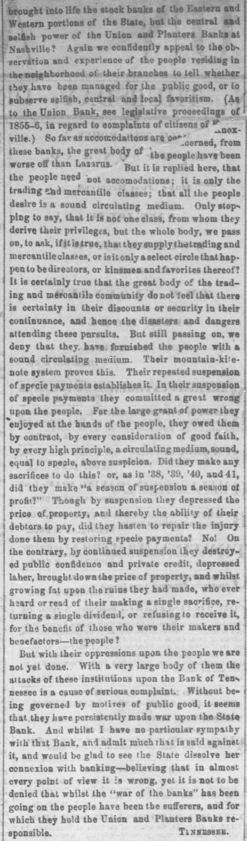 brought into life the stock banks of the Eastern and Western portions of the State, but the central and selfish power of the Union and Planters Banks at Nashville? Again we confidently appeal to the obs servation and experience of the people residing in the neightorhood of their branches to tell whether they have been managed for the public good, or to subserve selfish, central and local favoritism. (As to the Union Bank, see legislative proceedings of 1855-6, in regard to complaints of citizens of noxville.) So far as accomodations are 00 .cerned, from these banks, the great body of the people have been than off Lazarus. worse But it is replied here, that the people need not accomodations; it is only the trading end mercantile classes; that all the people desire is a sound circulating medium. Only stops ping to say, that it is not one class, from whom they derive their privileges, but the whole body, we pass on, to ask, if istrue, that they supply thetrading and mercantile classes, or isit only a select circle that happen to be directors, or kinsmen and favorites thereof? It is certainly true that the great body of the trading and mercantile community do not feel that there is certainty in their discounts or security in their continuance, and hence the disasters and dangers attending these pursuits. But still passing on, we deny that they. have furnished the people with a sound circulating medium. Their mountain-ki!enote system proves this. Their repeated suspension of specie payments establishes it. In their suspension of specie payments they committed a great wrong upon the people. For the large grant of power they enjoyed at the hands of the people, they owed them by contract, by every consideration of good faith, by every high principle, a circulating medium, sound, equal to specie, above suspicion. Did they make any sacrifices to do this? or, as in '38, '39, '40, and 41, did they make "a season of suspension a season of profit?" Though by suspension they depressed the price of property, and thereby the ability of their debtors to pay, did they hasten to repair the injury done them by restoring specie payments? No! On the contrary, by continued suspension they destroyed public confidence and private credit, depressed laber, brought the price of property, and whilst growing fat upon the ruins they had made, who ever heard or read of their making a single sacrifice, returning & single dividend, or refusing to receive it, for the benefit of those who were their makers and benefactors-the people But with their oppressions upon the people we are not yet done. With a very large body of them the attacks of these institutions upon the Bank of Tens nessee is a cause of serious complaint. Without be ing governed by motives of public good, it seems that they have persistently made war upon the State Bank. And whilst I have no particular sympathy with that Bank, and admit much that is said against it, and would be glad to see the State dissolve her connexion with banking-believing that in almost every point of view it is wrong, yet it is not to be denied tbat whilst the "war of the banks" has been going on the people have been the sufferers, and for which they hold the Union and Planters Banks reTinnessee. sponsible.
