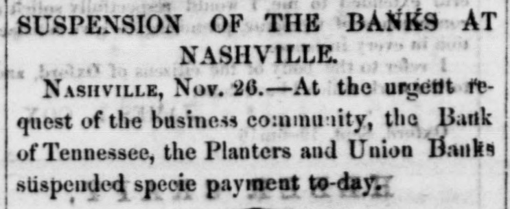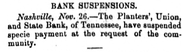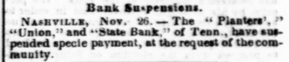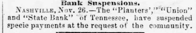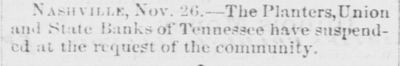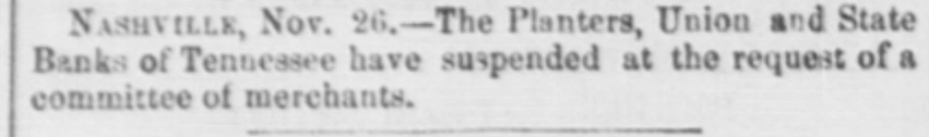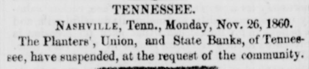 TENNESSEE. NASHVILLE, Tenn., Monday, Nov. 26, 1860. The Planters', Union, and State Banks, of Tennessee, have suspended, at the request of the community.