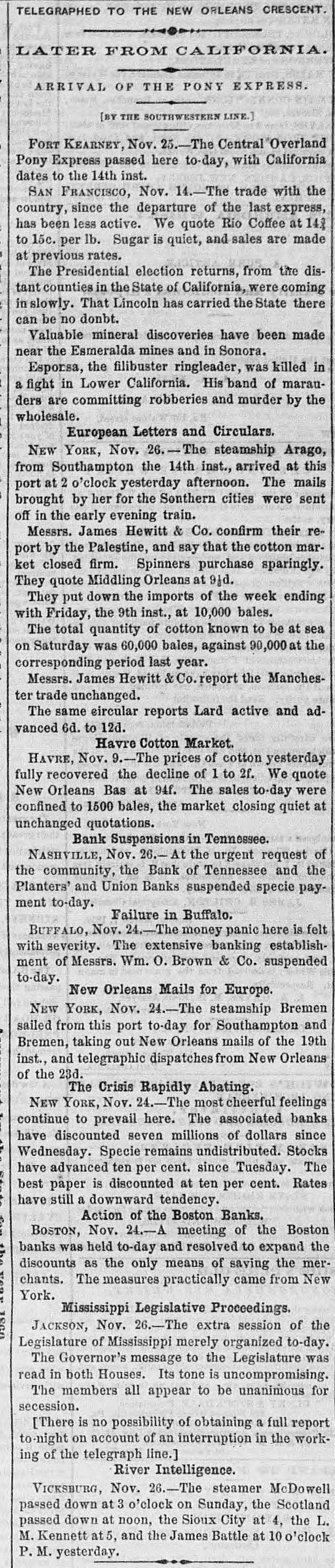 TELEGRAPHED TO THE NEW ORLEANS CRESCENT. LATER FROM CALIFORNIA. ARRIVAL OF THE PONY EXPRESS. [BY THE SOUTHWESTERN LINE.] FORT KEARNEY, Nov. 25.-The Central Overland Pony Express passed here to-day, with California dates to the 14th inst. SAN FRANCISCO, Nov. 14.-The trade with the country, since the departure of the last express, has been less active. We quote Rio Coffee at 142 to 15c. per lb. Sugar is quiet, and sales are made at previous rates. The Presidential election returns, from the distant counties in the State of California, were coming in slowly. That Lincoln has carried the State there can be no donbt. Valuable mineral discoveries have been made near the Esmeralda mines and in Sonora. Esporsa, the filibuster ringleader, was killed in a fight in Lower California. His band of marauders are committing robberies and murder by the wholesale. European Letters and Circulars. NEW YORK, Nov. 26.-The steamship Arago, from Southampton the 14th inst., arrived at this port at 2 o'clock yesterday afternoon. The mails brought by her for the Sonthern cities were sent off in the early evening train. Messrs. James Hewitt & Co. confirm their report by the Palestine, and say that the cotton market closed firm. Spinners purchase sparingly. They quote Middling Orleans at 91d. They put down the imports of the week ending with Friday, the 9th inst., at 10,000 bales. The total quantity of cotton known to be at sea on Saturday was 60,000 bales, against 90,000 at the corresponding period last year. Messrs. James Hewitt & Co. report the Manchester trade unchanged. The same circular reports Lard active and advanced 6d. to 12d. Havre Cotton Market. HAVRE, Nov. 9.-The prices of cotton yesterday fully recovered the decline of 1 to 2f. We quote New Orleans Bas at 94f. The sales to-day were confined to 1500 bales, the market closing quiet at unchanged quotations. Bank Suspensions in Tennessee. NASHVILLE, Nov. 26.-At the urgent request of the community, the Bank of Tennessee and the Planters' and Union Banks suspended specie payment to -day. Failure in Buffalo. BUFFALO, Nov. 24.-The money panic here is felt with severity. The extensive banking establishment of Messrs. Wm. o. Brown & Co. suspended to-day. New Orleans Mails for Europe. NEW YORK, Nov. 24.-The steamship Bremen sailed from this port to-day for Southampton and Bremen, taking out New Orleans mails of the 19th inst., and telegraphic dispatches from New Orleans of the 23d. The Crisis Rapidly Abating. NEW YORK, Nov. 24.-The most cheerful feelings continue to prevail here. The associated banks have discounted seven millions of dollars since Wednesday. Specie remains undistributed. Stocks have advanced ten per cent. since Tuesday. The best paper is discounted at ten per cent. Rates have still a downward tendency. Action of the Boston Banks. BOSTON, Nov. 24.-A meeting of the Boston banks was held to-day and resolved to expand the discounts as the only means of saving the merchants. The measures practically came from New York. Mississippi Legislative Proceedings. JACKSON, Nov. 26.-The extra session of the Legislature of Mississippi merely organized to-day. The Governor's message to the Legislature was read in both Houses. Its tone is uncompromising. The members all appear to be unanimous for secession. [There is no possibility of obtaining a full report to -night on account of an interruption in the working of the telegraph line.] River Intelligence. VICKSBURG, Nov. 26.-The steamer McDowell passed down at 3 o'clock on Sunday, the Scotland passed down at noon, the Sioux City at 4, the L. M. Kennett at 5, and the James Battle at 10 o'clock P. M. yesterday.