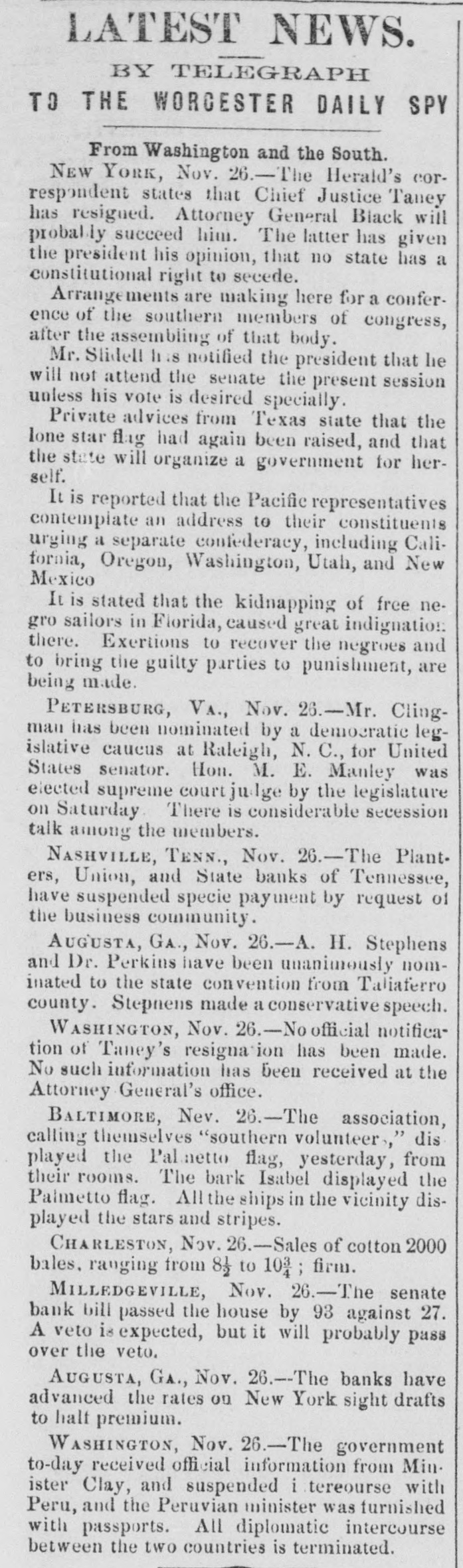 LATEST NEWS. BY TELEGRAPH TO THE WORCESTER DAILY SPY From Washington and the South. New York, Nov. 26.-The Herald's correspondent states that Chief Justice Taney has resigned. Attorney General Black will probably succeed him. The latter has given the president his opinion, that no state has a constitutional right to secede. Arrangements are making here for a conference of the southern members of congress, after the assembling of that body. Mr. Slidell his notified the president that he will not attend the senate the present session unless his vote is desired specially. Private advices from Texas state that the lone star flag had again been raised, and that the state will organize a government for herself. It is reported that the Pacific representatives contemplate an address to their constituents urging a separate confederacy, including California, Oregon, Washington, Utah, and New Mexico It is stated that the kidnapping of free negro sailors in Florida, caused great indignation there. Exertions to recover the negroes and to bring the guilty parties to punishment, are being made. PETERSBURG, Va., Nov. 26.-Mr. Clingman has been nominated by a democratic legislative caucus at Raleigh, N. C., for United States senator. Hon. M. E. Manley was elected supreme judge by the legislature on Saturday There is considerable secession talk among the members. Nashville, TENN., Nov. 26.-The Planters, Union, and State banks of Tennessee, have suspended specie payment by request of the business community. Augusta, GA., Nov. 26.-A. H. Stephens and Dr. Perkins have been unanimously nominated to the state convention from Taliaferro county. Stepnens made a conservative speech. WASHINGTON, Nov. 26.-No official notification of Taney's resignation has been made. No such information has been received at the Attorney General's office. BALTIMORE, Nev. 26.-The association, calling themselves "southern volunteer," dis played the Palnetto flag, yesterday, from their rooms. The bark Isabel displayed the Palmetto flag. Allthe ships in the vicinity displayed the stars and stripes. CHARLESTON, Nov. 26.-Sales of cotton 2000 bales. ranging from 81/2 to 10³₄ firm. Milledgeville, Nov. 26.-The senate bank bill passed the house by 93 against 27. A veto is expected, but it will probably pass over the veto. AUGUSTA, GA., Nov. 26.--The banks have advanced the rates on New York sight drafts to half premium. WASHINGTON, Nov. 26.-The government to-day received official information from Minister Clay, and suspended i tereourse with Peru, and the Peruvian minister was turnished with passports. All diplomatic intercourse between the two countries is terminated.