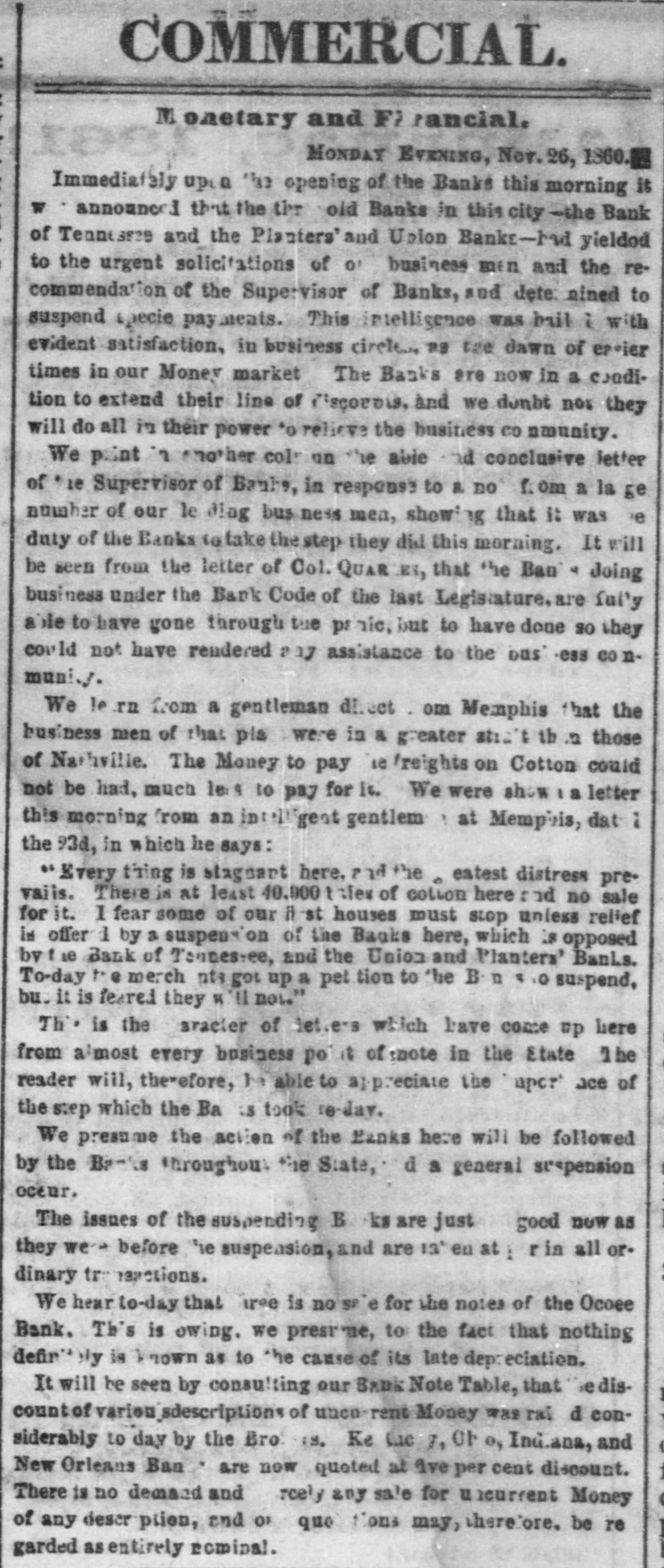 COMMERCIAL. M onetary and F) rancial. MONDAY EVENING, Nov. 26, 1860. Immediately up a the opening of the Banks this morning it announced that the the old Banks in this -the Bank of Tennessee and the Planters' and Union Banks-bad yieldod to the urgent solicitations of 0' business men and the recommendation of the Supervisor of Banks, and dete: nined to suspend specie pay ments. This intelligence was bail i with evident satisfaction, in business circle... as #28 dawn of er"ier times in our Money market The Banks are now in a e codition to extend their line of discounts, and we donbt not they will do all in their power to relieve the business CO nmunity. We print in smother coly un the able nd conclusive letter of * 10 Supervisor of Banks, in response to a. no om a la ge number of our le ding bus ness men, showing that it was e duty of the Banks take thestep they did this morning. It will be seen from the letter of Col. QUAR Ei, that the Ban` 4 doing business under the Bank Code of the last Legistature, are ful'y able to have gone through tue pr nic, but to have done so they could not have rendered 2 17 assistance to the bus' ess co nmuni.j. We le rn from a gentleman direct om Memphis that the business men of that pls were in & greater atta't th an those of Nathville. The Money to pay le freights on Cotton could not be had, much le: 9 to pay for it. We were show 1 a letter this morning from an gent gentlem at Mempinis, dat i the 93d, in which he says: Every thing is stagnart here. the e eatest distress prevails. There in at least 40,000 t ifex of cotton here nd no sale for it. I fear some of our il st houses must stop unless relief in offer 1 by a suspension of the Banks here, which is opposed by 10 Bank of Tennessee, and the Union and Planters' Banks. To-day the merch nts got up a pet tion to the B n 7:0 suspend, bu. it is feared they H 11 not." The is the aracter of let.ers which have come up here from almost every business po it finote in the Etate 1 he reader will, the*efore, he able to appreciate the upor' ace of the step which the Ba .3 took re-day. We presume the action of the Lanks here will be followed by the Banks throughout the State, d a general suspension occur. The issues of the suspending B kg are just good now as they were before "ie suspension, and are 13' en at ₁ r in all or. dinary tr: exctions. We hear to-day that iree is no SP e for the notes of the Ocoee Bank. This is owing. we presime, to the fact that nothing defin'' by is known as to the cause of its Inte dep: eciation. It will be seen by consulting our Bank Note Table, that discount of variou sdescriptions of unco-rent Money was d considerably to day by the Bro. 18. Ke Lac 7, or 0, Ind.ana, and New Orleans Ban are now quoted at five per cent discount. There is no demand and rely any sale for current Money of any descr ption, end OF que Cons may, there'ore. be re garded asentirely reminal.