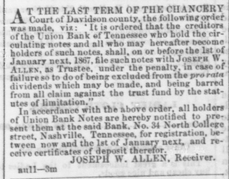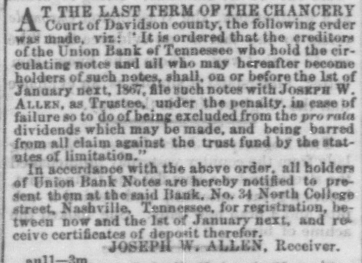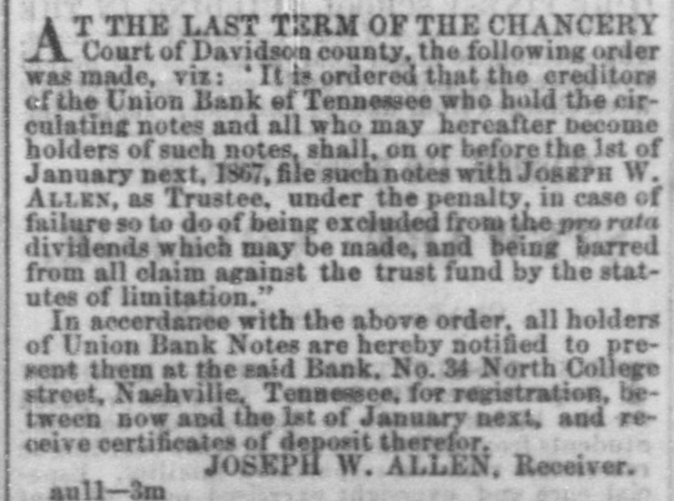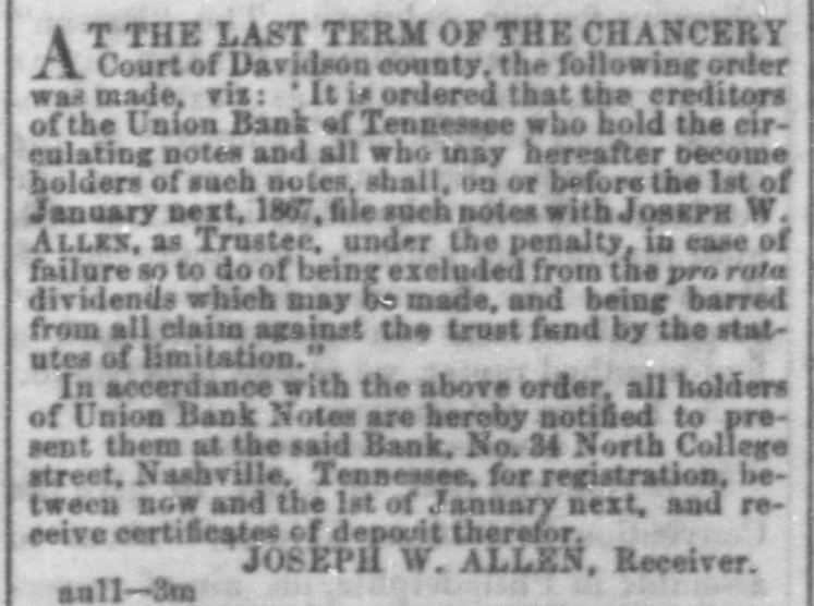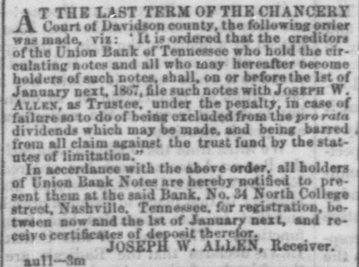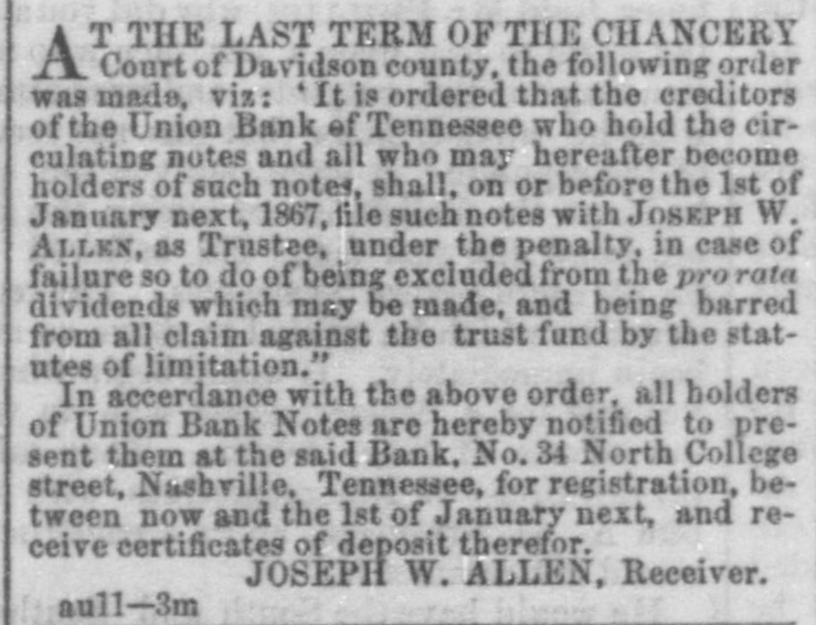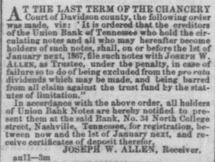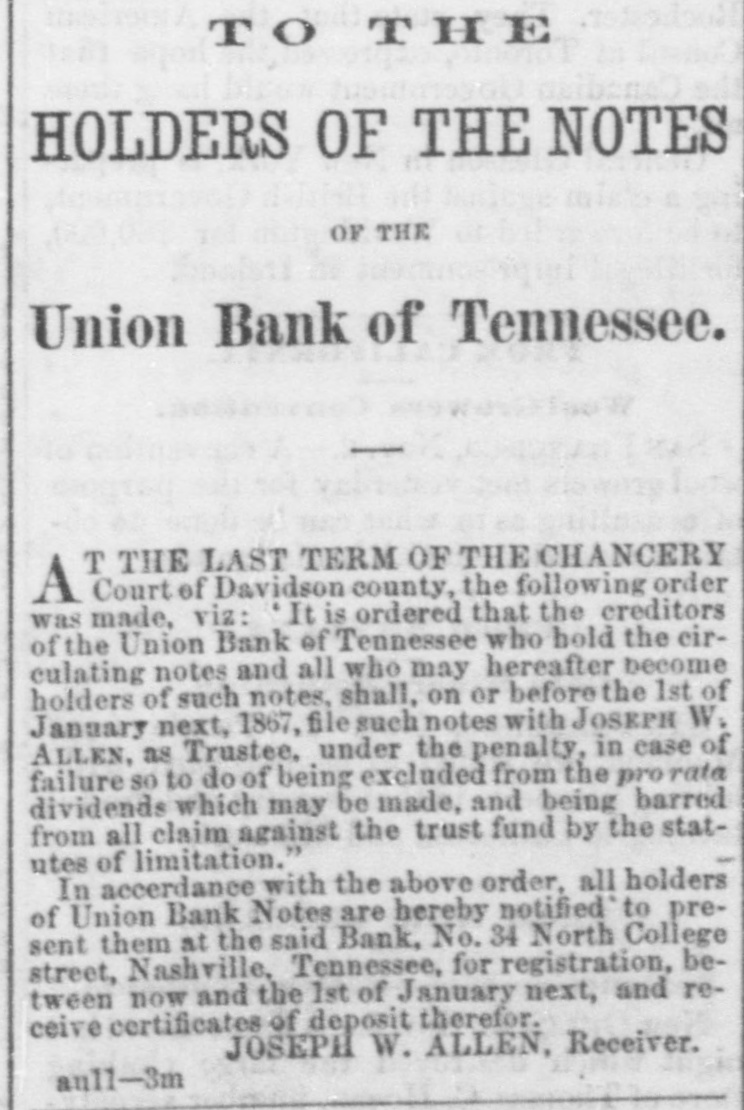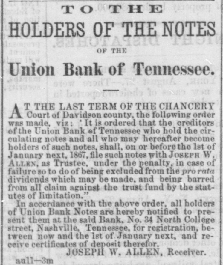 TO THE HOLDERS OF THE NOTES OF THE Union Bank of Tennessee. T THE LAST TERM OF THE CHANCERY A Court of Davidson county, the following order was made, viz: It is ordered that the creditors of the Union Bank of Tennessee who hold the circulating notes and all who may hereafter become holders of such notes, shall, on or before the 1st of January next, 1867, file such notes with JOSEPH W. ALLEN, as Trustee, under the penalty, in case of failure 80 to do of being excluded from the pro rata dividends which may be made, and being barred from all claim against the trust fund by the statutes of limitation." In accerdance with the above order. all holders of Union Bank Notes are hereby notified to present them at the said Bank, No. 34 North College street, Nashville, Tennessee, for registration, between now and the 1st of January next, and receive certificates of deposit therefor. JOSEPH W. ALLEN, Receiver. aull-3m