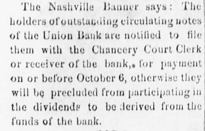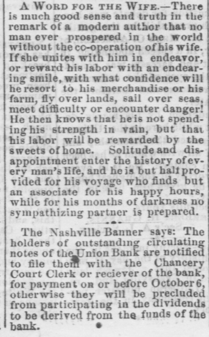 A WORD FOR THE WIFE.-There is much good sense and truth in the remark of a modern author that no man ever prospered in the world without the co-operation of his wife. she unites with him in endeavor, or reward his labor with an endearing smile, with what confidence will he resort to his merchandise or his farm, fly over lands, sail over seas, meet difficulty or encounter danger! He then knows that heis not spending his strength in vain, but that his labor will be rewarded by the sweets of home. Solitude and disappointment enter the history ofevery man's life, and he is but half provided for his voyage who finds but an associate for his happy hours, while for his months of darkness no sympathizing partner is prepared. The Nashville Banner says: The holders of outstanding circulating notes of the Union Bank are notified to file them with the Chancery Court Clerk or reciever of the bank, for payment OR or before October 6, otherwis they will be precluded from participating in the dividends to be derived from the funds of the bank.