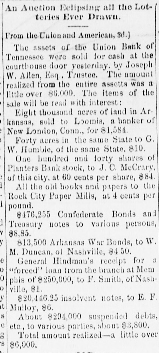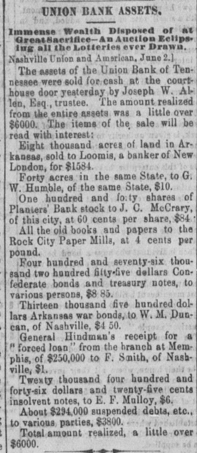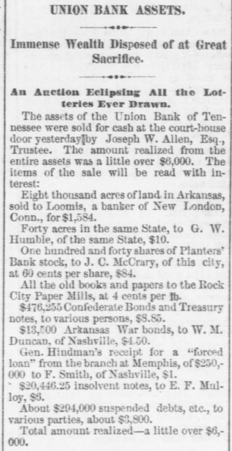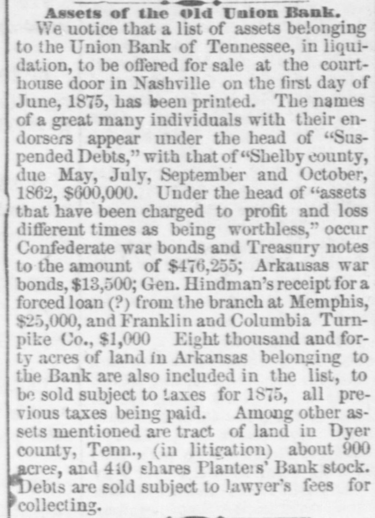 Assets of the Old Union Bank. We uotice that a list of assets belonging to the Union Bank of Tennessee, in liquidation, to be offered for sale at the courthouse door in Nashville on the first day of June, 1875, has been printed. The names of a great many individuals with their endorsers appear under the head of "Suspended Debts," with that of "Shelby county, due May, July, September and October, 1862, $600,000. Under the head of "assets that have been charged to profit and loss different times as being worthless," occur Confederate war bonds and Treasury notes to the amount of $476,255; Arkansas war bonds, $13,500; Gen. Hindman's receipt for a forced loan (?) from the branch at Memphis, $25,000, and Franklin and Columbia Turnpike Co., $1,000 Eight thousand and forty acres of land in Arkansas belonging to the Bank are also included in the list, to be sold subject to taxes for 1875, all previous taxes being paid. Among other assets mentioned are tract of land in Dyer county, Tenn., (in litigation) about 900 acres, and 410 shares Planters' Bank stock. Debts are sold subject to lawyer's fees for collecting.