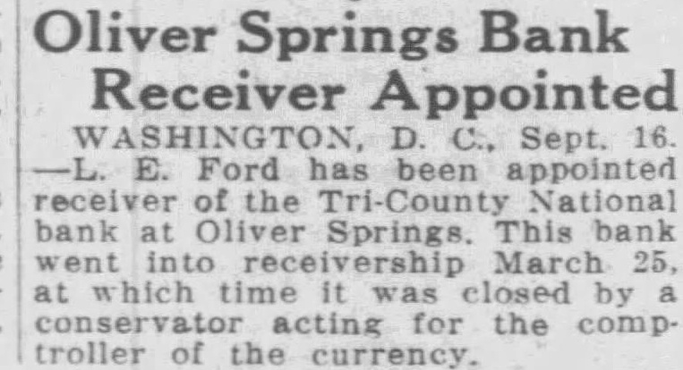 Oliver Springs Bank Receiver Appointed Sept. 16. E. Ford has been appointed receiver of the Tri-County National bank Oliver This bank into March which time was closed by acting for the comptroller of the currency.