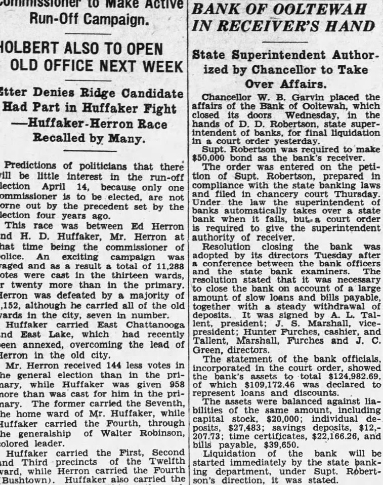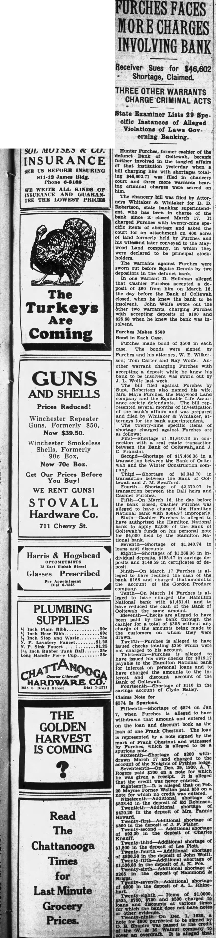 SOL MOYSES & co. Hunter Furches, former cashier of the defunct Bank of Ooltewah, became INSURANCE further involved in the tangled affairs that institution yesterday when US BEFORE INSURING SEE bill charging him with shortages totalJames Bldg. ing $46,602.71 filed in Phone 6-8188 court and three more bearing criminal charges were served on WE WRITE ALL KINDS OF him. INSURANCE AND GUARANThe chancery bill was filed by AttorTEE THE LOWEST PRICES neys Whitaker & Whitaker for D. Robertson, state banking charge of the bank since closed March 17. It charged with specific items of shortage and asked the court for an attachment 400 on acres of land held by Furches and his later to the Maywood Land company, in which they were declared to be principal stockholders. The warrants against Furches were sworn out before Squire Dennis by two depositors in the defunct bank. In D. Hollohan alleged that Cashier Furches deposit of $60 from him on March 16, The the day before the Bank of Ooltewah closed, when he knew the bank to be insolvent. John Wolfe swore out the Turkeys other warrants, charging Furches with accepting deposits $100 and when knew the bank was inAre solvent.