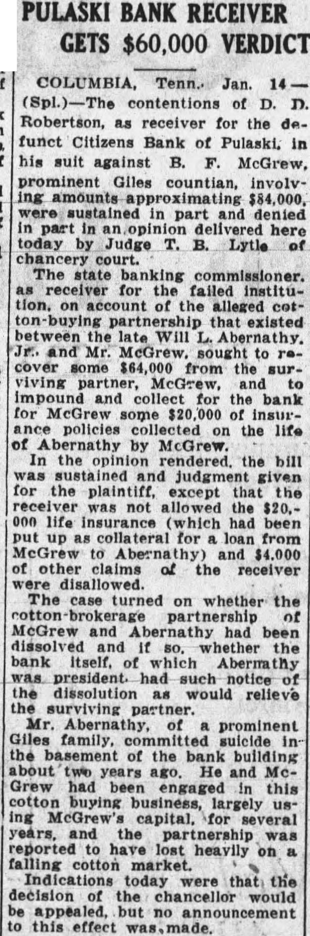 PULASKI BANK RECEIVER GETS $60,000 VERDICT COLUMBIA, Jan. contentions of D. D. Robertson, as receiver for the defunct Citizens Bank of Pulaski. in his suit against B. F. McGrew, Giles countian, involving part and denied part here today by Judge Lytle The state banking commissioner. receiver for the failed institution. account the alleged cotpartnership that existed the late sought cover some from the viving impound and collect for the bank for McGrew some insurpolicies collected on the life Abernathy by McGrew. In the rendered. the bill given the except allowed the 000 life insurance had been from McGrew Abernathy) and other claims of the receiver The case on whether the McGrew and had been dissolved bank Itself. which Abermathy president. such notice the dissolution would relieve surviving Abernathy, prominent the the bank building years He and McGrew had been this cotton buying using McGrew's capital. years, and the partnership was reported have heavily falling cotton market. Indications today were the the chancellor would announcement effect